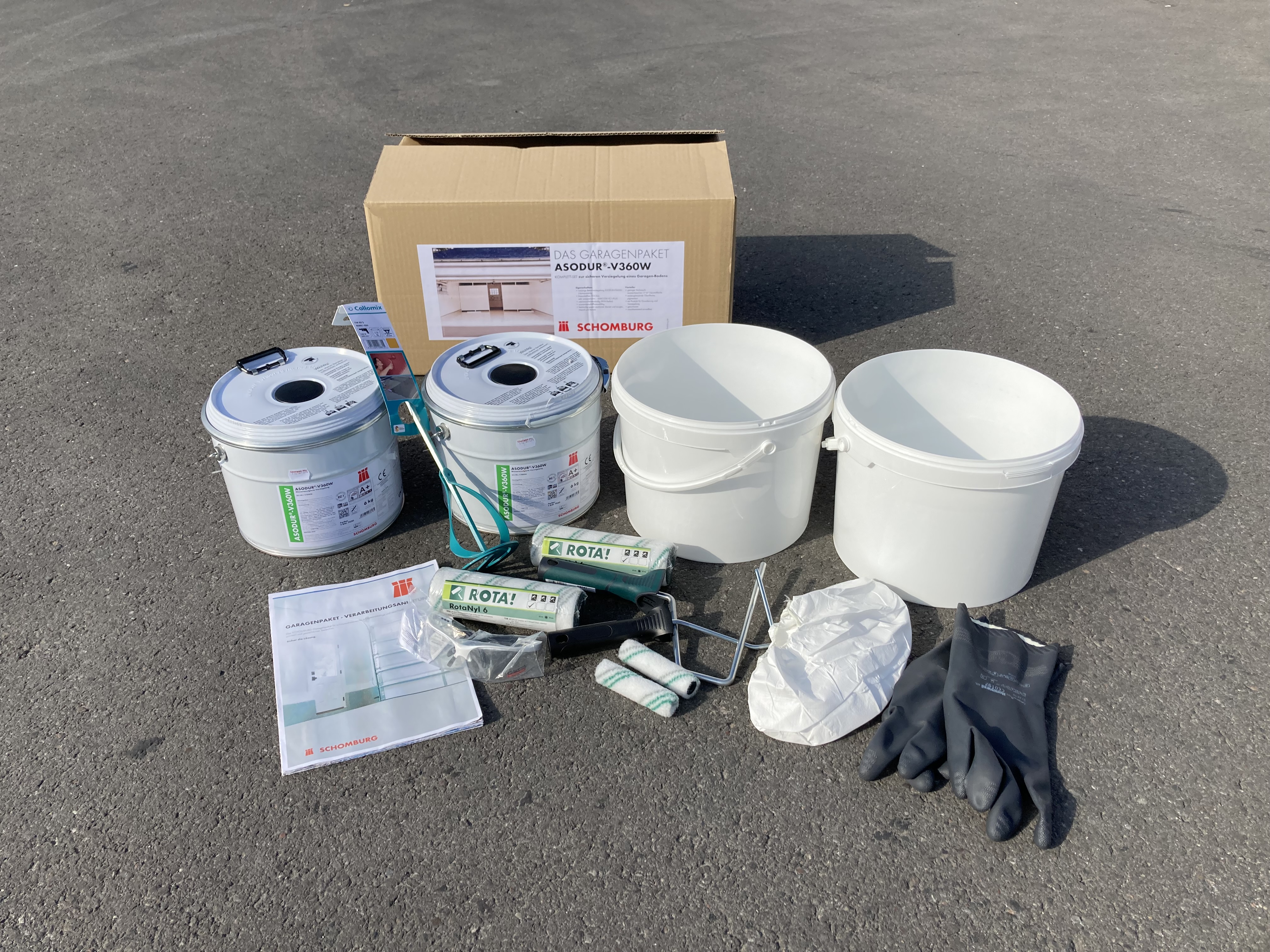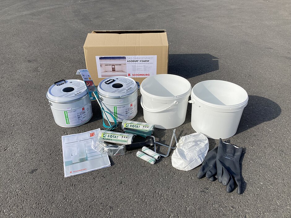 Das Komplett-Set für ca. 18 Quadratmeter Bodenfläche beinhaltet alles, um nach einer vorausgehenden Untergrundprüfung und ggfs. -vorbereitung sofort loslegen zu können. Als Grundierung und Deckbeschichtung kommt das zweikomponentige Epoxidharz Asodur-V360W von Schomburg zum Einsatz. Zusätzlich umfasst das Garagenpaket zwei Kunststoffeimer zum Mischen und Umtopfen, einen hochwertigen Collomix-Rührer, diverse Rollen für den flächigen Auftrag sowie für den Sockel und den Randbereich, ein Paar geprüfte Nitril-Handschuhe, eine Schutzbrille und ein Paar Schuhüberzieher. Die ebenfalls beiliegende Verarbeitungsanleitung im praktischen A1-Poster-Format zum Aufhängen soll dem Anwender auf einem Blick eine hilfreiche und detaillierte Übersicht aller durchzuführenden Verarbeitungsschritte bieten.