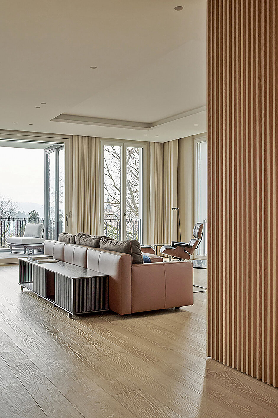 In einem Privathaus mit Blick auf Baden-Baden kommen hochwertig veredelte Holzoberflächen von Schotten & Hansen vielfältig zum Einsatz: vom Boden über Türen, Stufen bis hin zu Möbeln. Der Bauherr legte großen Wert auf Natürlichkeit und eine ressourcenschonende Verarbeitung.