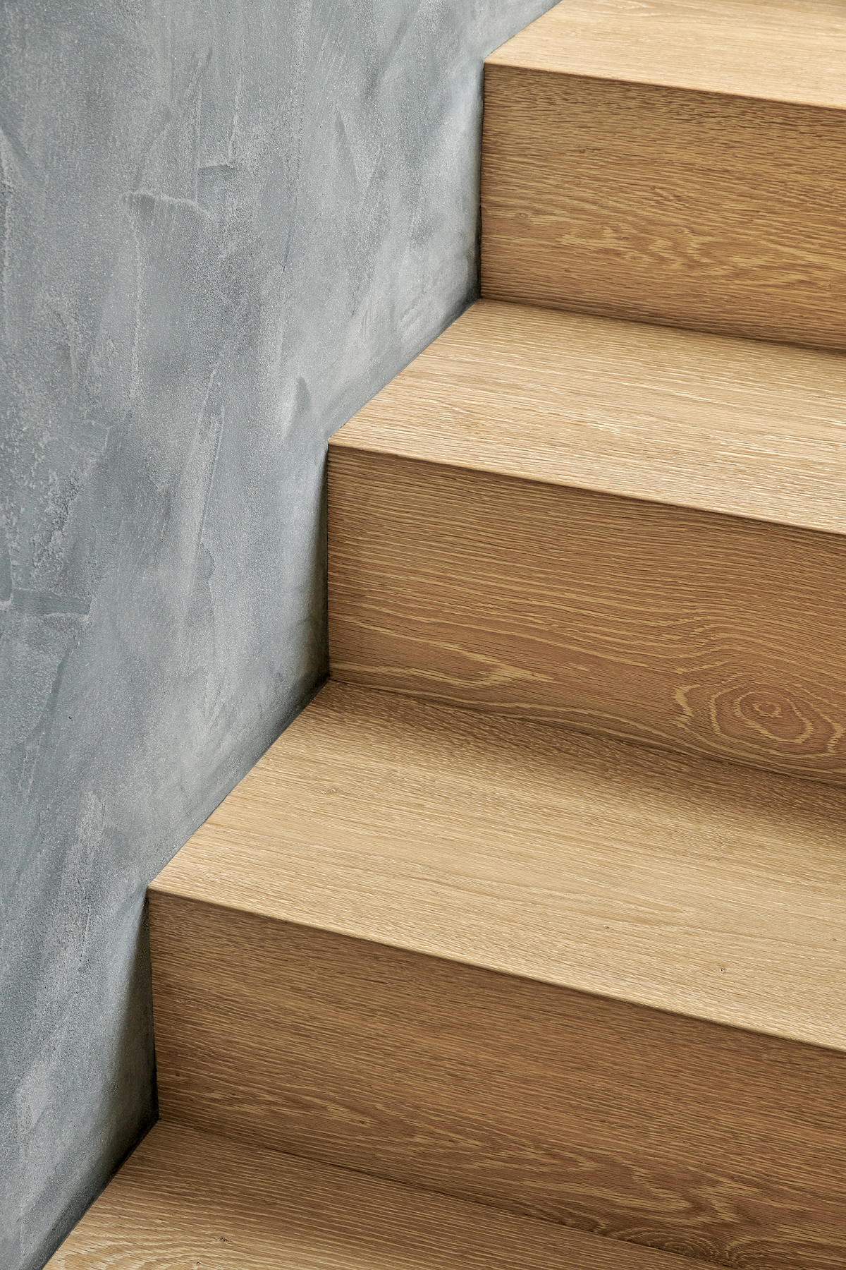 Geschützt wird das Holz durch eine Emulsion aus natürlichen Harzen, Wachsen und Ölen. Der natürliche Schutz hält allerdings nicht nur der milden Beanspruchung in den üblichen privaten Räumlichkeiten wie Wohn- oder Schlafbereichen stand. Selbst Nässe gegenüber ist die Holzoberfläche wenig empfindlich. Weshalb sie auch in Badezimmern oder Spa- oder Fitnessbereichen funktioniert. Schließlich ist dort das raumwarme, weiche Barfußgefühl am häufigsten zu spüren.