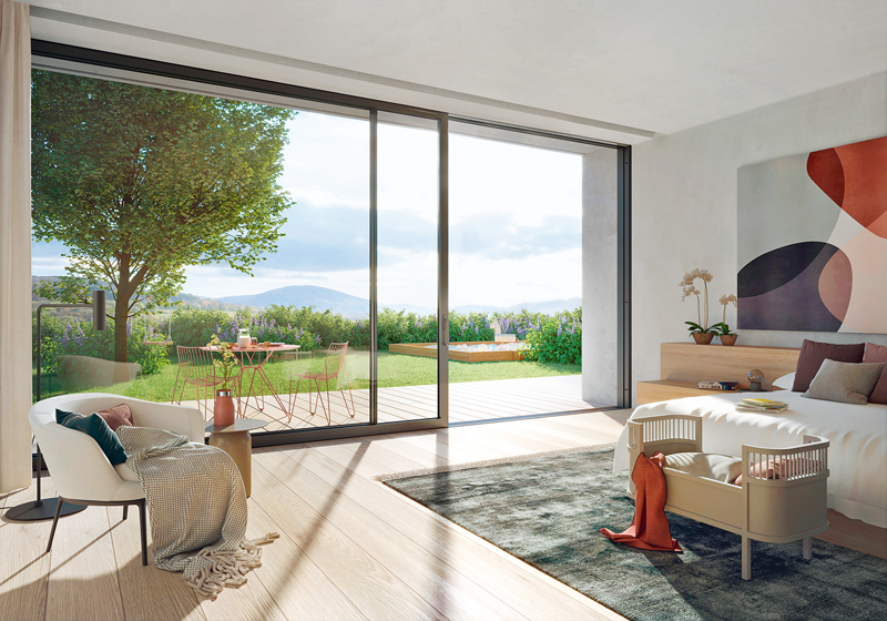 Neben den Fenstern und Türen müssen auch Schiebesysteme besondere Anforderungen erfüllen, um komfortabel und leicht für alle Bewohner gleichermaßen nutzbar zu sein. Hier wird eine bodengleiche Schwelle deshalb ebenfalls gefordert. Die Schüco Aluminium-Schiebe- und Hebeschiebesysteme »ASE 60« (Aluminium Sliding Element, Bautiefe 60 mm) und »ASE 80.HI« (Aluminium Sliding Element, High Insulated, Bautiefe 80 mm) wie auch das Hebeschiebesystem »Schüco LivIngSlide« aus Kunststoff erfüllen diese Anforderungen. Und auch die klassischen Anforderungen wie eine effektive Wärmedämmung und eine Einbruchsicherheit bis RC 2 können in Kombination mit der Nullschwelle bei den Schiebe- und Hebeschiebesystemen aus Aluminium und Kunststoff problemlos realisiert werden. J