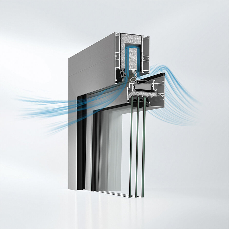 Das neue Akustikfenster »Schüco AWS 90 AC.SI« (Aluminium Window System, 90 mm Bautiefe, Acoustics, Super Insulated) habe besonders für Wohn- und Bürogebäude in lärmbelasteten Arealen einen hohen Nutzerkomfort zu bieten. In Schalldämm-Kippstellung wird die einströmende Außenluft über im oberen Blendrahmen eingesetzte vorkonfektionierte Lüftungskassetten geleitet. Auf diese Weise baut sich der Schall ab und die Lärmbelästigung wird deutlich reduziert. Es lässt sich dadurch eine Schalldämmwirkung von 31 dB bei gleichzeitiger natürlicher Lüftung erreichen. Es gibt die Variante Dreh-Kipp-Fenster und die Variante Dreh-Dreh-Fenster mit zwei Drehöffnungsstellungen. Das Dreh-Dreh-Fenster kann in eine begrenzte Drehposition zur schallgedämmten Lüftung gebracht werden. Es kann auch komplett aufgedreht werden.