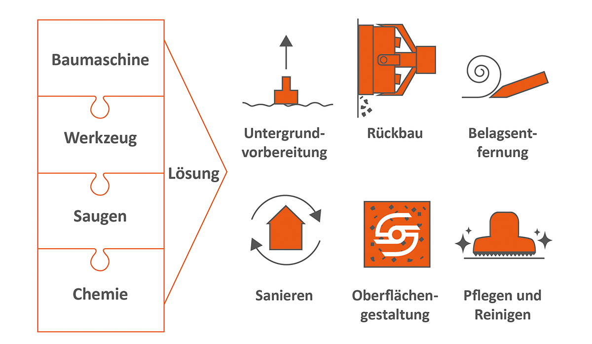 »Wir denken in Lösungen«, betont CEO Eckart Schwamborn. So sei in der über 85-jährigen Geschichte des Familienunternehmens ein mittlerweile perfektioniertes »System Schwamborn« entstanden. Denn die konkrete Anwendung und das Ziel der Bodenbearbeitung definiert die Konfiguration von Maschine, Werkzeug, Staubab-saugung und Chemie.»Deshalb geht unser System immer von der Aufgabenstellung aus und berücksichtigt alle denkbaren Komponenten für Untergrundvorbereitung, Belagsentfernung und Rückbau, Sanierung und Oberflächengestaltung sowie die Vereinfachung der dauerhaften Pflege und Reinigung von Böden«, führt Schwam-born weiter aus.
