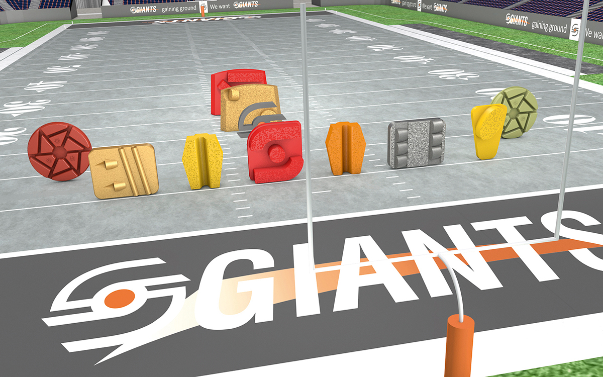 Wer Boden gut machen will, benötigt das bestmögliche Werkzeug. Das gilt für alle Arbeiten von der Entschichtung, über die Untergrundvorbereitung und Sanierung bis zur Herstellung von Design-Betonböden. Für all diese Arbeiten bietet Schwamborn Spezialwerkzeuge an, die optimal aufeinander abgestimmt sind und unterschiedliche Aufgaben haben. Raumgewinn sei das zentrale Qualitätsmerkmal. Deshalb habe die neue Generation der Diamantwerkzeuge den Namen Giants bekommen. So räumen zum Beispiel die Giants Center auch die stärkste Betondefense ab, während die Wide Receiver Superflex Pads mit hoher Geschwindigkeit für den letzten Schliff in der End-zone sorgen.