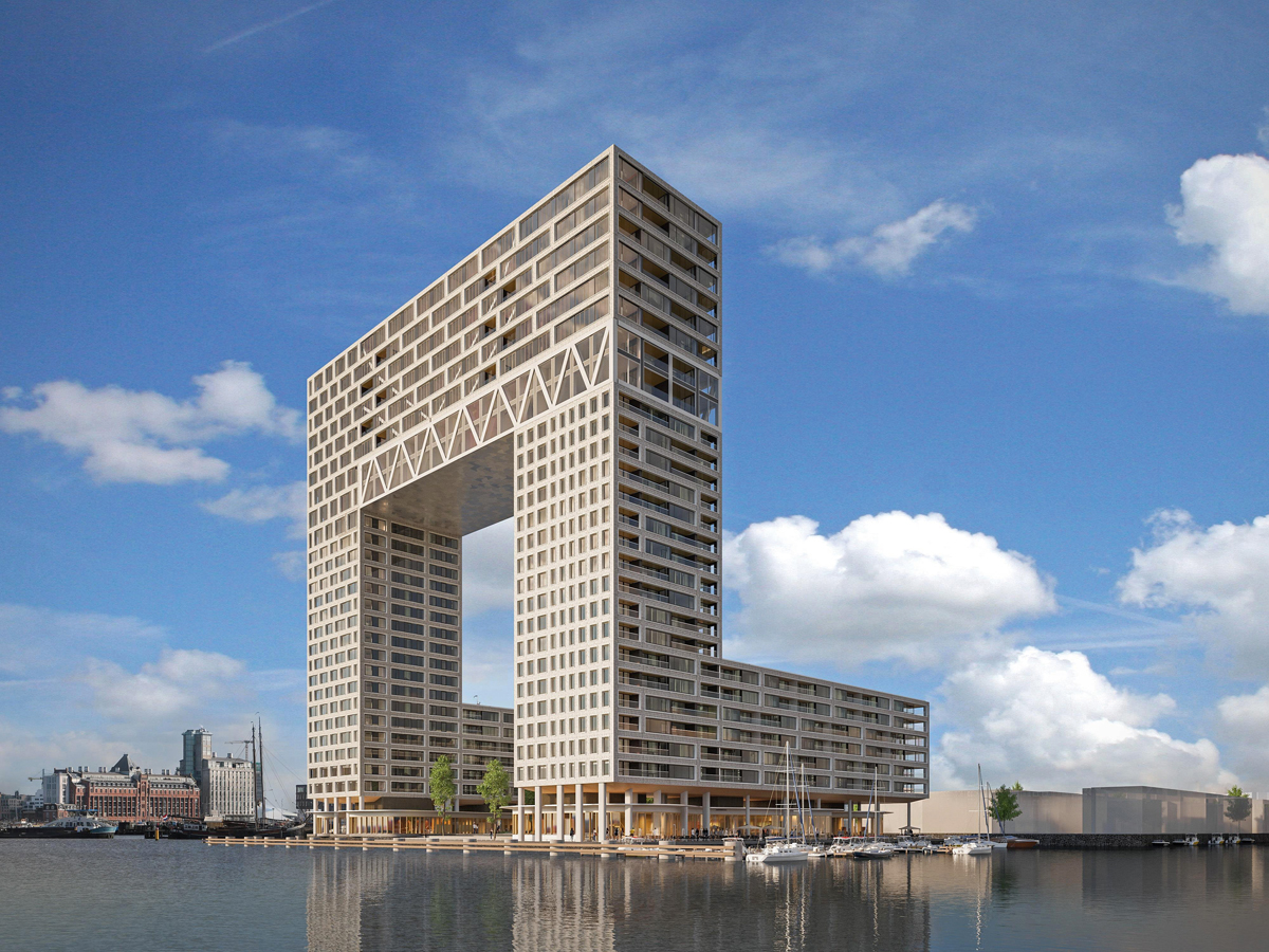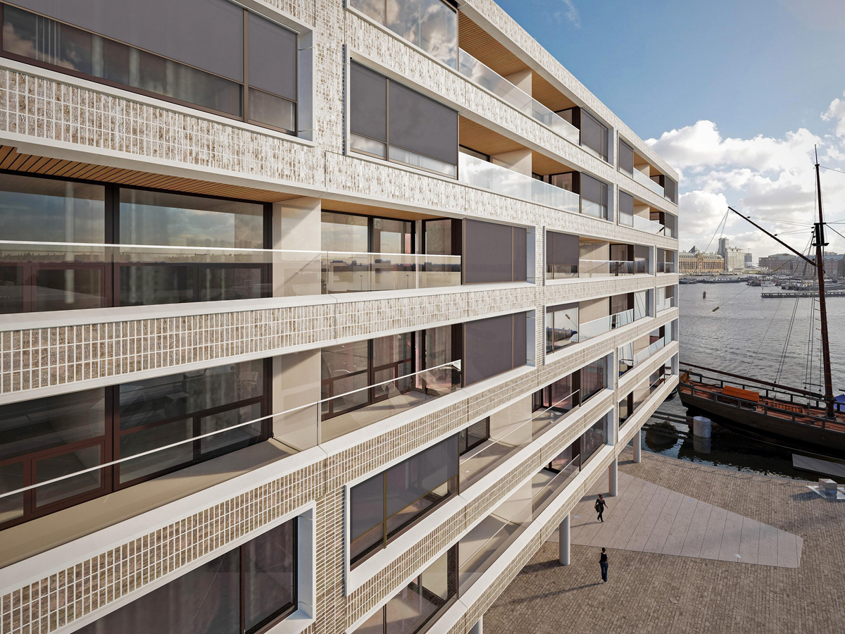 Es ist ein architektonisch besonderes und markantes Gebäude, das die Kulisse Amsterdams prägt. Über 90 Meter ragt der »Pontsteiger« (deutsch Fähranleger) mit seiner aufgeklappten Blockrandform in die Höhe. Unter einem großen Objektdach werden im neuen Stadtteil Houthaven Wohnen, Gastronomie, Hotellerie sowie Gewerbe vereint. Für passgenauen Sonnenschutz am futuristisch anmutenden Bauwerk sorgen Screens des niederländischen Unternehmens Schellekens & Schellekens. Gefahren werden sie mit leistungsstarker Selve-Antriebstechnik: Hunderte »SE Plus«-Antriebe sind hier im Einsatz.