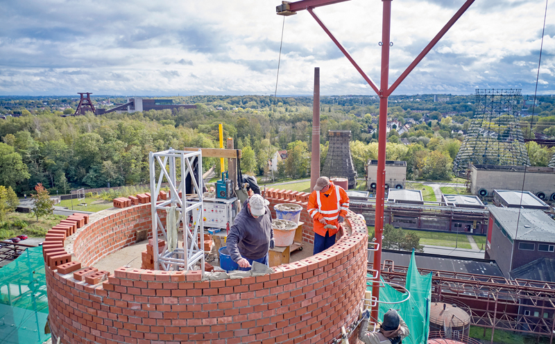 »Das kommt uns beim aktuellen Projekt natürlich sehr entgegen«, sagt Diplom-Ingenieur Sebastian Scholz, der bei der Stiftung Zollverein für die Standortentwicklung verantwortlich ist. Denn Fakt ist: »Die Sanierung des S4 ist die mit Abstand aufwendigste Sanierungsmaßnahme aller sechs Schornsteine. Entgegen unserer ursprünglichen Planung mussten wir den alten Schornstein komplett zurück- und neu aufbauen lassen.« Das trieb den Zeitplan und auch die Sanierungskosten in die Höhe und umso wichtiger ist es dem Bauherrn jetzt, dass die insgesamt 2,5 Mio. Euro teure Maßnahme möglichst lange Bestand hat.