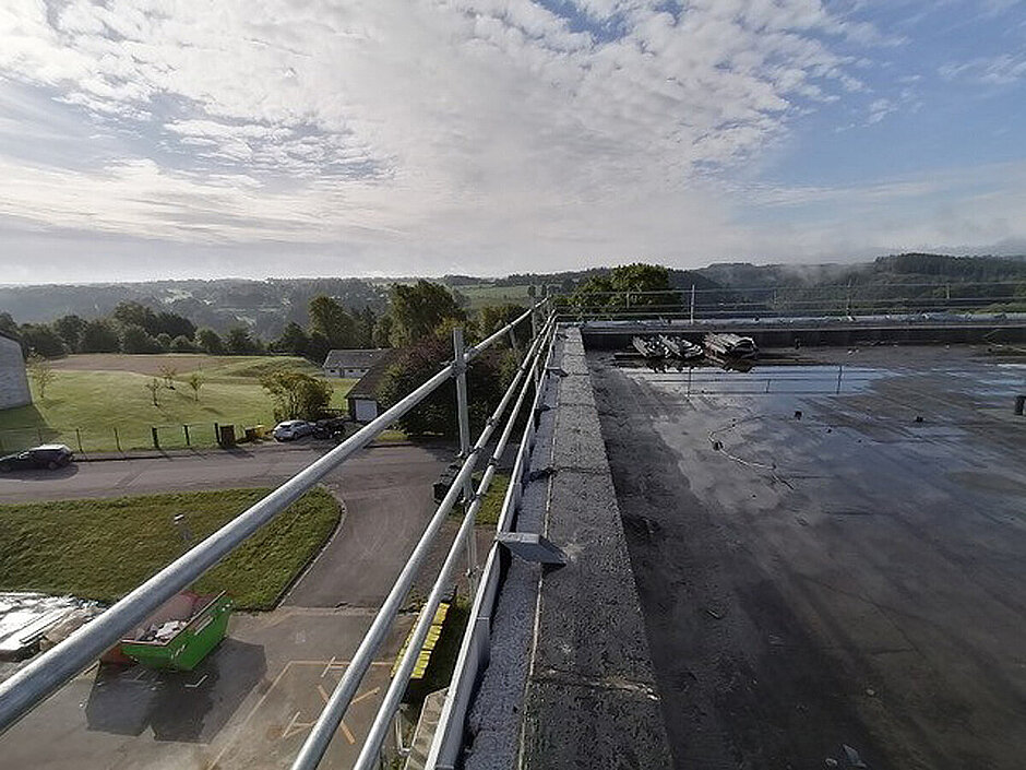 Die Sanierungsarbeiten begleiteten die Planer und Architekten vom Architekturbüro Hansen & Hano aus Übach-Palenberg. Besondere Beachtung erforderte die Planung der Flachdachrandsicherung, denn gemäß den strengen Richtlinien der BG Bau müssen an Arbeitsplätzen und Verkehrswegen auf Dächern zulässige Absturzsicherungssysteme vorhanden sein. Bei Arbeiten in einer Absturzhöhe von über 3 m sind temporäre Absturzsicherungen, die ein Abstürzen von Personen und/oder Materialien verhindern, erforderlich. Da die Fassadenarbeiten bereits abgewickelt waren und das Gerüst nicht mehr zur Verfügung stand, suchten die Projektverantwortlichen nach einer Möglichkeit, den Dachrand für den Zeitraum der Arbeiten zu sichern.