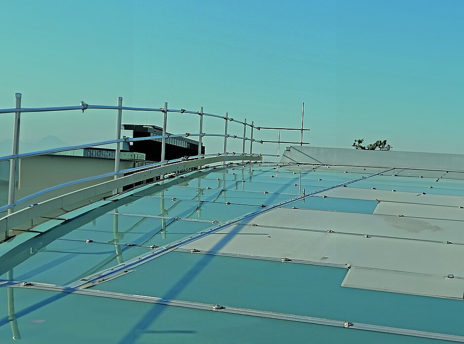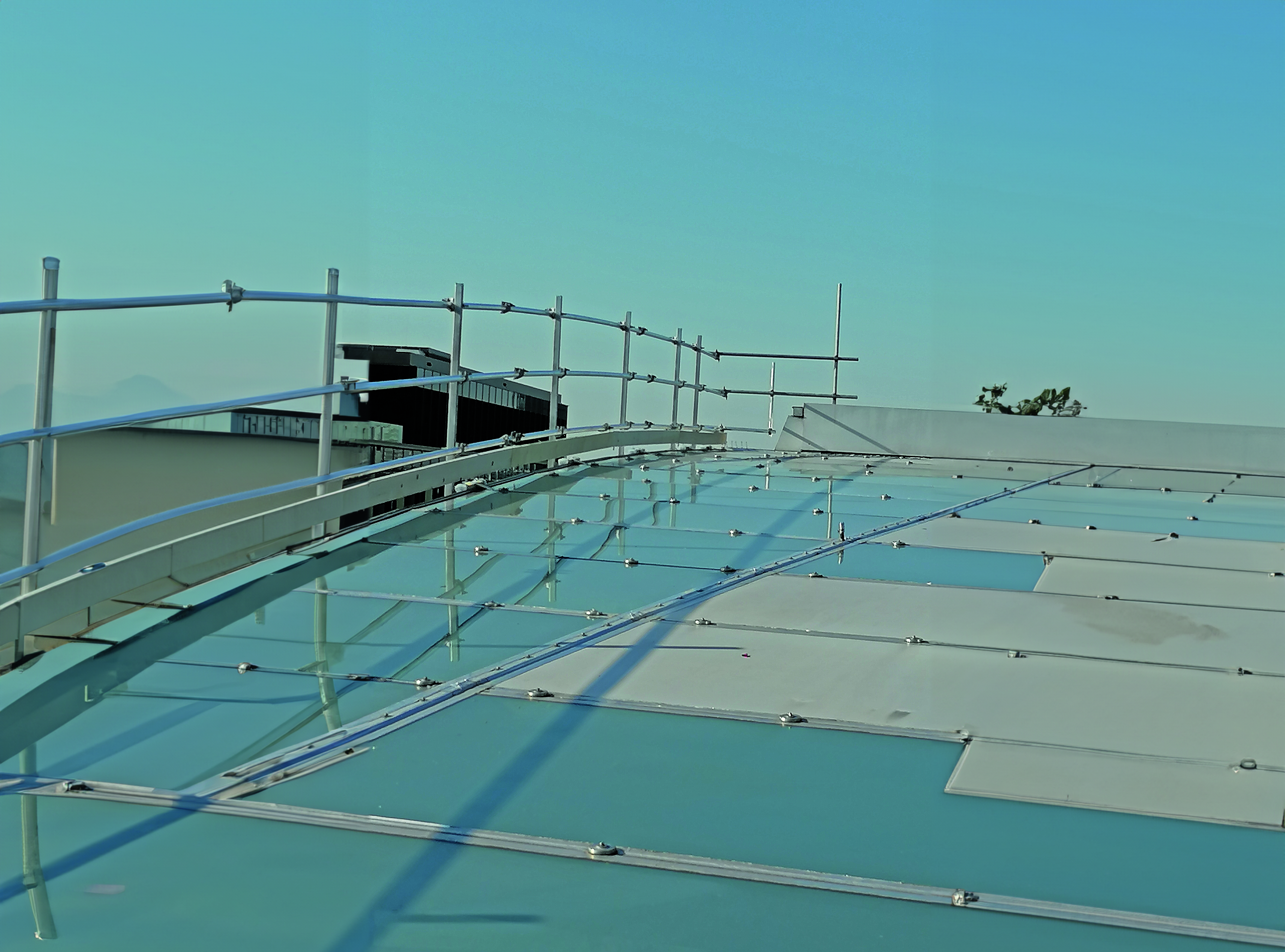 Herausforderung war der geringe Platzbedarf der Befestigung. Anspruch war eine barrierefreie Lösung, die so viel Raum für Abdichtungsarbeiten zulässt wie möglich. Für dieses Bauvorhaben wurden spezielle Halteplatten angefertigt, die entsprechend des Gebäudes noch unauffälliger sind als die üblichen. An der Traufseite wurde ergänzend eine Pfosten-Riegel-Konstruktion erstellt. Auch den Vorstellungen bezüglich des Sicherheitskonzeptes wurde der Experte für Absturzsicherheit mit einer eigens angefertigten Statik gerecht.
