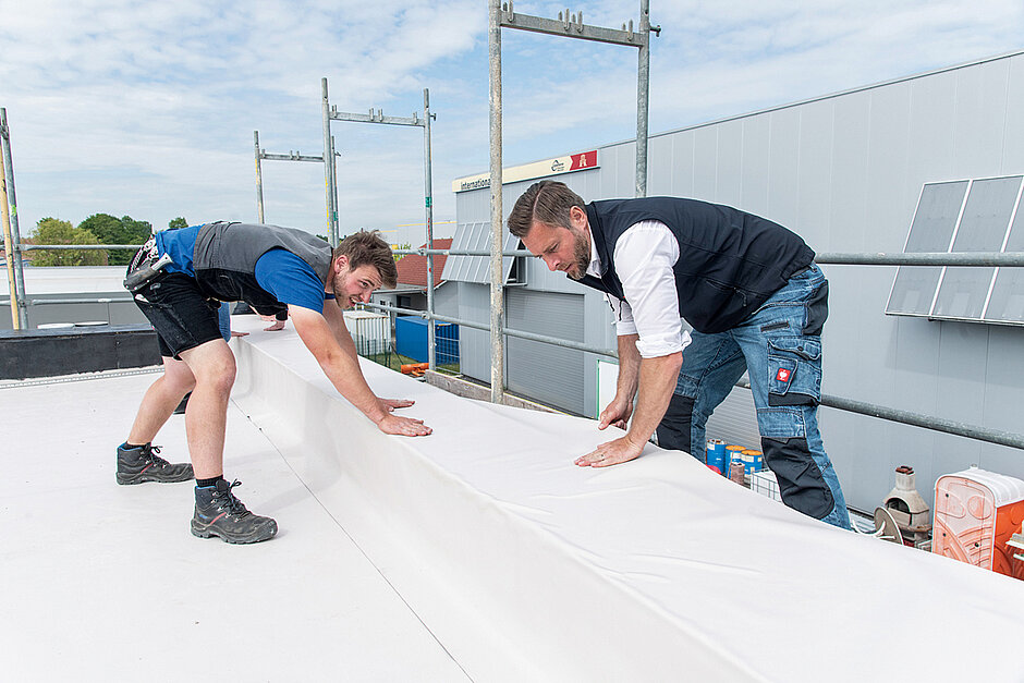 Eine Besonderheit des Projekts stellte der Attikaaufbau dar. Die Außenwand verfügt über keine Dämmung, da der verwendete Poroton-Stein dämmt. Deshalb musste die Attika nicht zusätzlich gedämmt werden. Es war nur notwendig, die Dämmung auf die Betondecke zu legen und stumpf vor den Stein zu führen. Auf die mit »Primer-780« vorbehandelte Attika wurde dann die Anschlussbahn »Sarnafil AT-18 FSA P« verlegt. Auf dem Trapezblech der Lagerhalle wurde das Dach mechanisch befestigt. Dabei kam die Kunststoffabdichtungsbahn »Sikaplan G-18« zum Einsatz, zur Leckageortung wurde unter der Abdichtung ein RCS Glasvlies verlegt.J