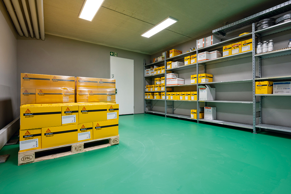 Die Grundierung der Bodenfugen zwischen den Betonfertigteilen in der neuen Lagerhalle erfolgte mit »Sika Primer-215«. Der nicht pigmentierte WHG-konforme Systemprimer wurde für die haftvermittelnde Vorbereitung der Fugenflanken in Kombination mit »Sikaflex Tank-N« eingesetzt, dem Systemdichtstoff für WHG-Verfugungen. Für die Böden in den Büro- und Sozialräumen entschied sich das Unternehmen für eine Beschichtung mit dem »Sika ComfortFloor System PS-24«. Der durchgehende, flüssig aufgetragene Boden ist vollkommen nahtlos und dadurch reinigungs- und pflegefreundlich. Die Bodenfläche erhielt zunächst eine Grundierung und Egalisierung mit dem 2-komponentigen, mechanisch hochfesten Epoxidharzbindemittel »Sikafloor-161«. Anschließend wurde die lösemittelfreie und elastische Verlaufsbeschichtung »Sikafloor-3000« im Farbton RAL 7015 (Anthrazit) aufgebracht. Die abschließende Versiegelung erfolgte mit dem farblosen »Sikafloor-304 W«. Der Boden im Lagerraum erhielt die 2-komponentige Beschichtung »Sikafloor-3240« in RAL 6030 (Grün). Der Fließbelag für Industriefußböden basiert auf der i-Cure Polyurethan-Technologie von Sika, einer patentierten Vernetzungstechnologie für Produkte auf PU-Basis. Die Versiegelung erfolgte mit »Sikafloor 305W«, die schwarzen Randfugen wurden mit »SikaFlex PRO-3« behandelt.