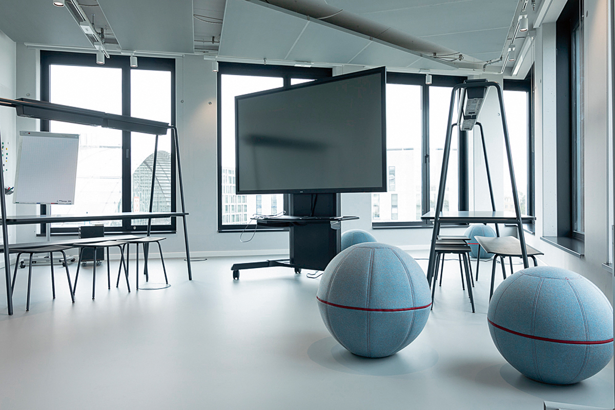 Als Grundierung wurde »Sikafloor-151« eingesetzt. Mit der anschließenden Dämmschicht »Sikafloor-320« lässt sich der Trittschall laut Hersteller um 13 dB reduzieren. Die darauf applizierte PU-Beschichtung »Sikafloor-3000« ist emissionsarm und erfüllt daher die höchsten Qualitätsanforderungen des Systems der Deutschen Gesellschaft für Nachhaltiges Bauen (DGNB) an diese Produktgruppe. Die Lichtechtheit und Farbtonstabilität unterstreichen die Dauerhaftigkeit des Produkts. Die transparente PU-Versiegelung »Sikafloor-306 W« zeichnet sich durch einen sehr niedrigen VOC-Gehalt (Flüchtige organische Verbindungen) aus. Mit einer handwerklich hochwertigen Verarbeitung lässt sich eine absolut homogene Oberfläche erzielen. Das große Plus der Versiegelung ist laut Sika ihre geprüfte Stuhlrolleneignung, die in Kombination mit der Beschichtung »Sikafloor-3000« ermöglicht wird. Auch die fugenlose Oberfläche trägt dazu bei, dass keinerlei Tiefenverschmutzung der Beschichtung entsteht. Das Ergebnis ist eine dauerhaft makellose Optik und Strapazierfähigkeit des Bodens, der zudem mit seinen nachhaltigen Eigenschaften überzeugt. J