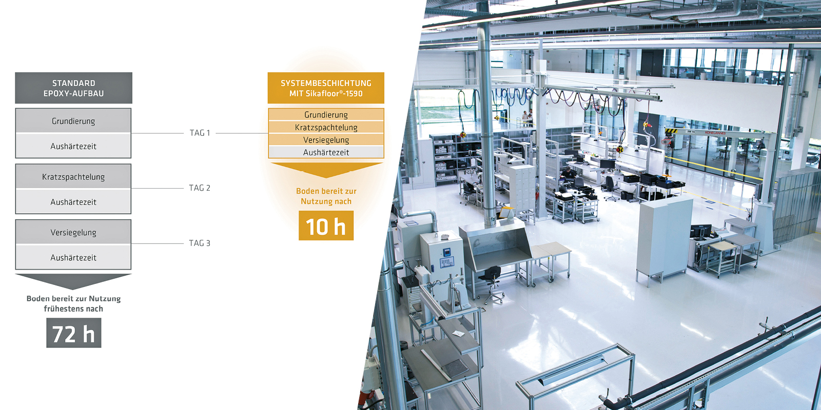 Eine schnelle Aushärtung hat den Vorteil, dass alle Systemschichten an einem Tag appliziert werden können. Das reduziert die An- und Abfahrten zur Baustelle und stellt eine produktive und wirtschaftliche Baustellenbearbeitung sicher. Im Vergleich zu einem Standard-Epoxid-Aufbau ist bei einer Systembeschichtung mit den Sika-Neuprodukten »Sikafloor-1590« und »Sikafloor-2650« eine volle Nutzung des Bodens bereits nach zehn Stunden möglich.