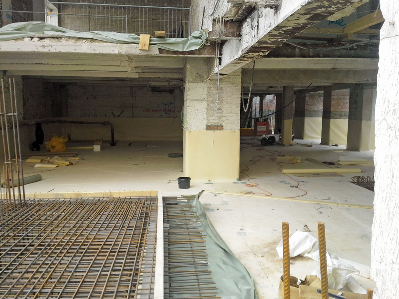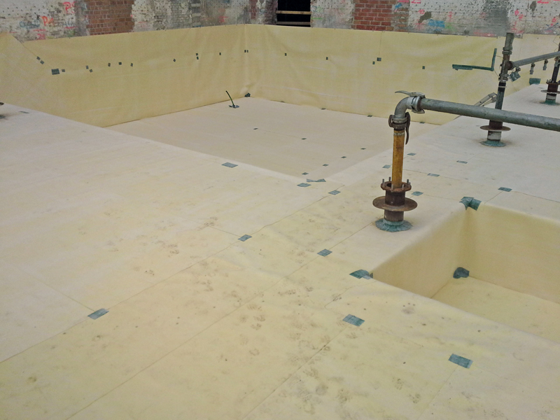 Im Deutschlandhaus in Berlin wurde »SikaProof A« auf den 2 500 m2 Bestandsflächen im Boden- und Wandbereich bis oberhalb des Bemessungswasserstandes verlegt. Eine nachträgliche Horizontalsperre sichert die Bestandswände gegen aufsteigende Feuchtigkeit ab. Durchdringungen wie Rohrdurchführungen wurden direkt in das Frischbetonverbundsystem eingebunden. Für Nähte, Übergänge und Detailausbildungen stehen entsprechendes Zubehör oder geprüfte Kombinationssysteme, wie zum Beispiel das »Sikadur-Combiflex TF System«, zur Verfügung. Nach der Verlegung der Bahnen erfolgten die Bewehrungsarbeiten. Anschließend wurde direkt gegen das »SikaProof A« System betoniert. In Kombination mit der daraus resultierenden dauerhaften Verbundwirkung mit Rissüberbrückung und Hinterlaufschutz stellt die gewählte Konstruktion laut Sika eine höchstmögliche Nutzungssicherheit der neuen Räumlichkeiten im Kellergeschoss des Deutschlandhauses sicher. J