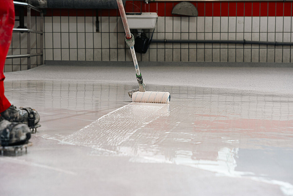Der Untergrund wurde mit einem transparenten, lösemittelfreien, niedrigviskosen, zweikomponentigen Epoxidharz-Bindemittel grundiert. Das fertig angemischte Material »Silikal PU Concrete M« wurde dann auf den zu beschichtenden Boden entleert und mit einem Stiftrakel verteilt. Gewählt wurde eine Schichtdicke von 10 mm. Sofort nach dem Aufrakeln wurde es mit einer Stachelwalze nachentlüftet. Innerhalb von 24 Stunden wurde die Deckschicht aus »Silikal PU Concrete Top Coat« aufgetragen, appliziert mit einem Hartgummischieber und mit der Kurzflorwalze nachgerollt.