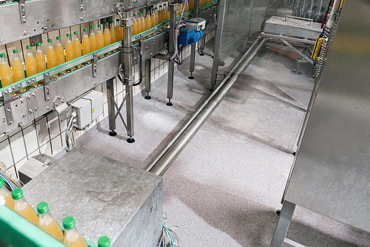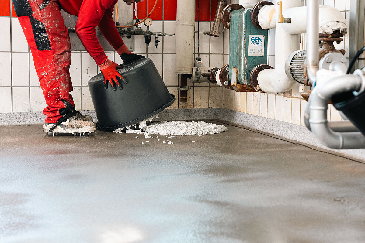 Für den Bereich rund um die neue Flaschenwaschanlage wählte der Fachverlegebetrieb als Bodenbelag die polyurethanbasierte Zementspachtelmasse »Silikal PU Concrete M«. Sie zeichnet sich durch hohe thermische und mechanische Belastbarkeit aus, wichtig bei heißem Wasser in diesem Arbeitsbereich.