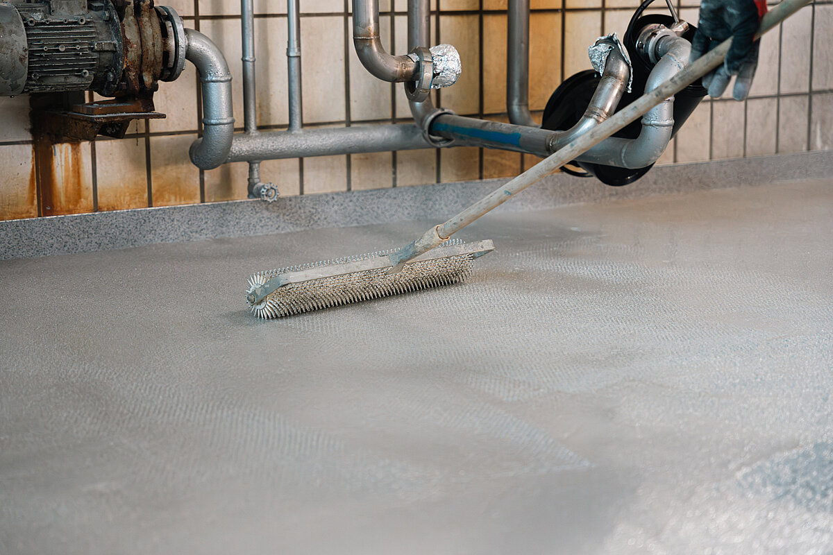 Die vorbereitenden Arbeitsschritte für die neue Bodenbeschichtung bilden die Basis für ein sicheres und sauberes Endergebnis: So musste im Produktionsbereich der Untergrund auf etwa 200 m2 trocken, tragfähig und frei von trennend wirkenden Substanzen wie Chemikalien, Fett und Öl sein. Er wurde deshalb mittels Diamantschleifen vorbereitet und staubfrei mit einem Sauger gereinigt. Außerdem wurden im Abstand von ca. 15 cm entlang aller Wände, an den Flächenbegrenzungen, entlang der vorhandenen Fugen und an den Bodeneinläufen Ankerschnitte gesetzt.