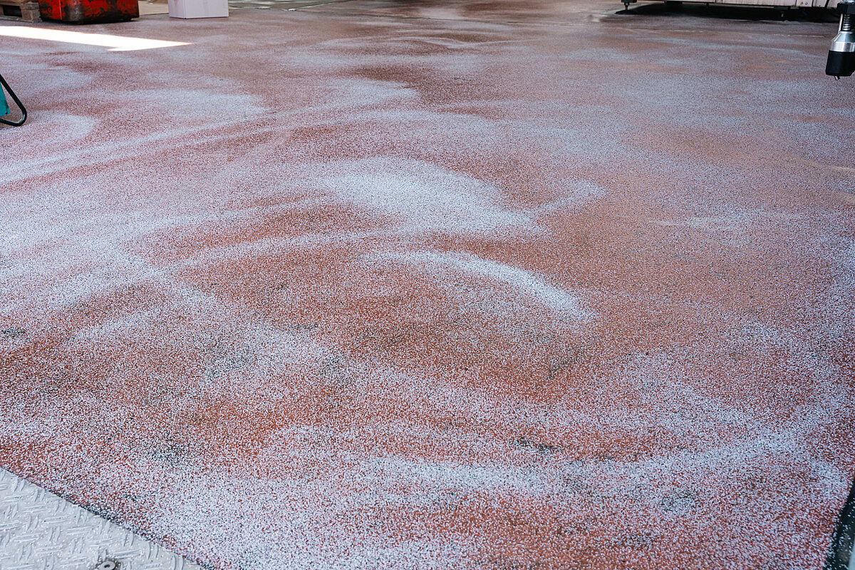 An den Übergängen vom Boden zur Wand wurde ein Aluminiumprofil befestigt und eine Hohlkehle als Wandabschluss angearbeitet. Verwendet wurde dafür die MMA-Hohlkehlenpaste »Silikal HK 31«. Durch Zumischen von Farbsanden gleicht sie sich farblich an den Boden an. Glatte und fugenlose Wandabschlüsse sind unerlässlich für eine gute Reinigung und somit für einen hygienischen Boden. Als Hauptschicht wurden ebenfalls »Silikal RU 368« und Füllstoffe appliziert. Abgestreut wurde mit der Silikal-Colorquarzmischung »FM 6«. Die Hauptschicht war – wie üblich bei Silikal-MMA-Böden – nach einer Stunde voll ausgehärtet. Anschließend wurden die überschüssigen Farbsande abgefegt bzw. abgesaugt.