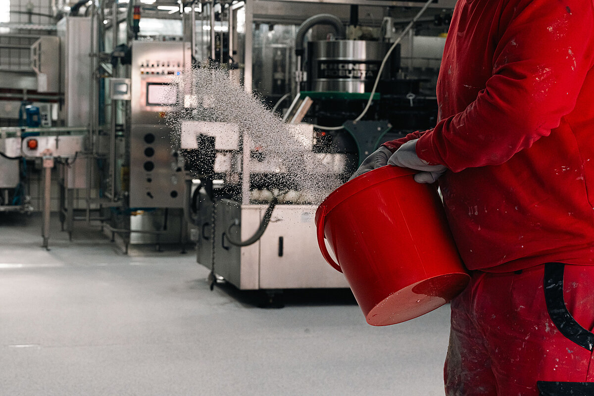 Für die umgebende Fläche von 160 m2 empfahl sich ein Silikal-Bodensystem auf Basis von MMA – schnell aushärtend, robust und hygienisch: Das »Silikal System B: Quartz SL« ist eine dekorative und hochbelastbare Beschichtung für trockene und nasse Produktionsbereiche. Durch die Einstreuung von Silikal-Farbsand wurde die dort erforderliche Rutschhemmstufe erreicht.