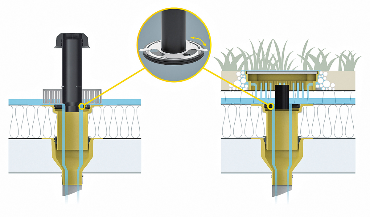 Notentwässerung ist Pflicht. Aber auf Gründächern ist dafür oft nicht viel Platz. Hier kommt der »SitaMore« Anstauring als platzsparende Alternative zum Einsatz. 300 mm hoch wird er bauseits auf Länge gekürzt. In Kombination mit der »SitaRetention Twist« eignet sich dieses Bauteil für einen planmäßigen Daueranstau auf dem Retentions-Flachdach.