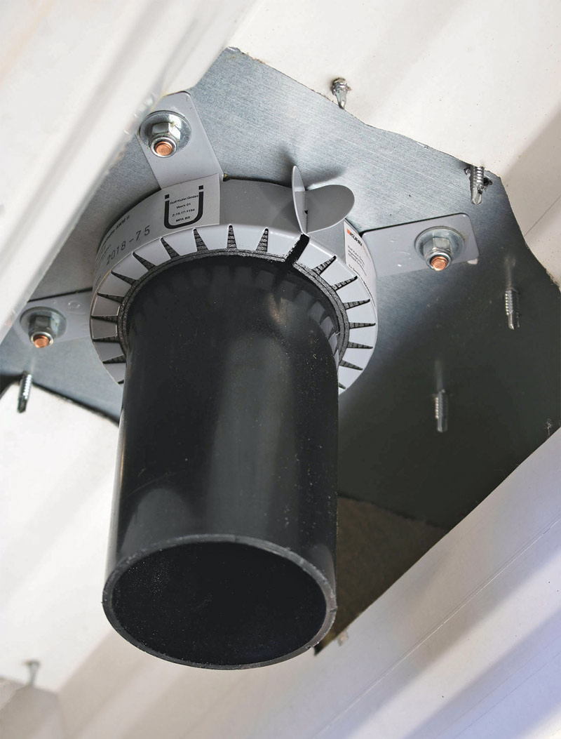 Wie ein Sicherheitsring wacht die fest mit dem Verstärkungsblech verbundene Brandschutzmanschette für den Fall, der hoffentlich nie eintritt: Ein Brand im Innenbereich des Gebäudes. Wird die Manschette direkt dem Feuer ausgesetzt, macht sie nach eigenen Angaben sofort dicht. Das heißt: Sie schäumt auf, verschließt die Dachdurchdringung und damit dem Feuer den Weg auf das Flachdach.