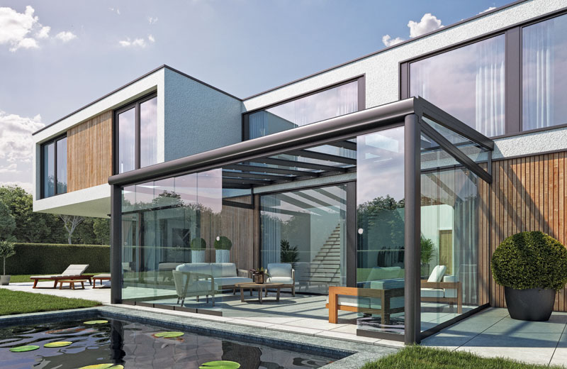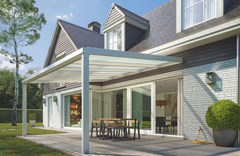 Das bewährte, selbsttragende Aluminium-Profilsystem der Marke »Climalux« ist eine schnelle und budgetfreundliche Lösung zum Bau von Terrassenüberdachungen, einer Pergola oder eines Carports mit kurzer Lieferzeit in 24 Standardmaßen und acht Farben direkt ab Lager. Das System ist montagefreundlich, da das Dachrinnen- und Mauerprofil aus einem Stück besteht und so mit wenigen Alu-Profilen ein vollwertiges Dach errichtet werden kann. Die Ausführung kann mit 16 mm Polycarbonat-, Sandwichplatten oder Sicherheitsglas (8 mm oder 10 mm) sowie Dachüberstand mit einem Neigungswinkel zwischen 5 und 10 Grad erfolgen. Für zusätzlichen Komfort und Schutz vor Wind und Regen sowie zur Verlängerung der Nutzung kommen »Climaglide«-Schiebetüren aus Einscheibensicherheitsglas zum Einsatz. Sie können durch das hochwertige und stabile Schiebesystem schnell und problemlos bedient werden. An warmen Sommerabenden können sie komplett geöffnet werden und bieten an kühleren Tagen einen guten Schutz gegen die Witterung.