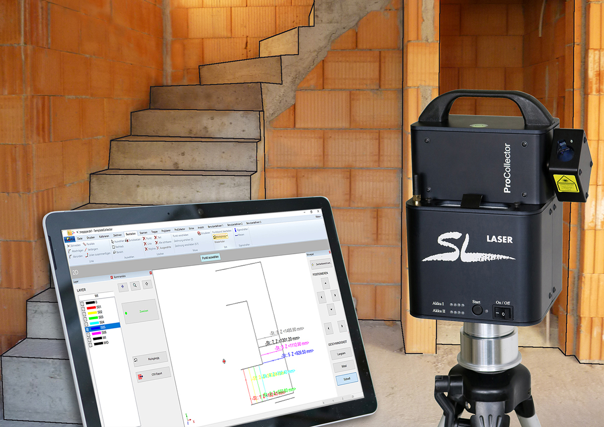 Der mobile »ProCollector« wird als Aufmaß-System gern beim Treppenbau oder auch bei der Montage von Einbauküchen verwendet. Mit wenigen Referenzpunkten entsteht eine 3D-Messung, die in horizontale und vertikale Verläufe umgerechnet wird. Die erfassten Daten werden in eine DXF-Datei eingetragen und können in der CAD-Software des Kunden weiterverarbeitet werden.