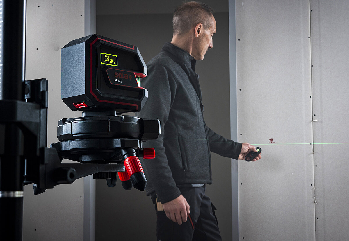 Sola präsentiert mit dem »RCB« eine elektronische Basis für Lasergeräte zur schnellen und präzisen Feinjustierung von Laserlinien. Die Laserbasis wird per Fernbedienung gesteuert. Dadurch lassen sich vertikale und horizontale Laserlinien rasch, exakt und kontaktlos ausrichten. Ein manuelles Nachjustieren direkt am Gerät ist nicht erforderlich. Das spart Zeit, reduziert Laufwege und erleichtert effiziente Arbeitsabläufe auf der Baustelle. Die mitgelieferte Fernbedienung ermöglicht das Ausrichten der Laserlinien aus einer Entfernung von bis zu 30 m.