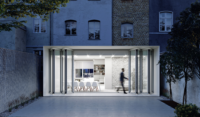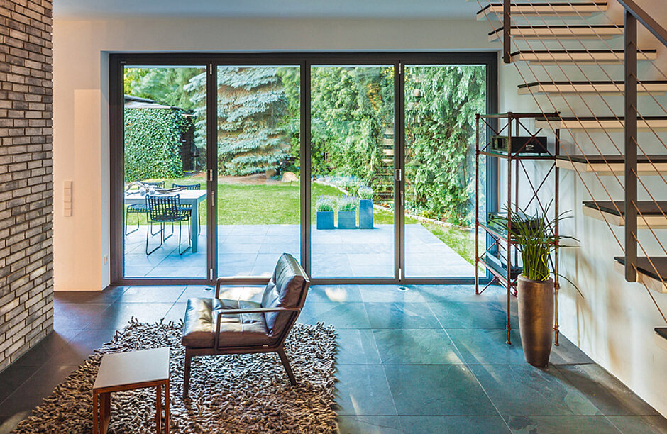 Demnach sind Bauvarianten sowohl nach links oder rechts als auch nach links und rechts möglich. Beispielsweise können zwei Glaselemente links oder sechs rechts gebaut werden – eine andere denkbare Konstellation wären zwei Elemente links und vier rechts. Alle Varianten können zudem innen oder außen öffnend umgesetzt werden.