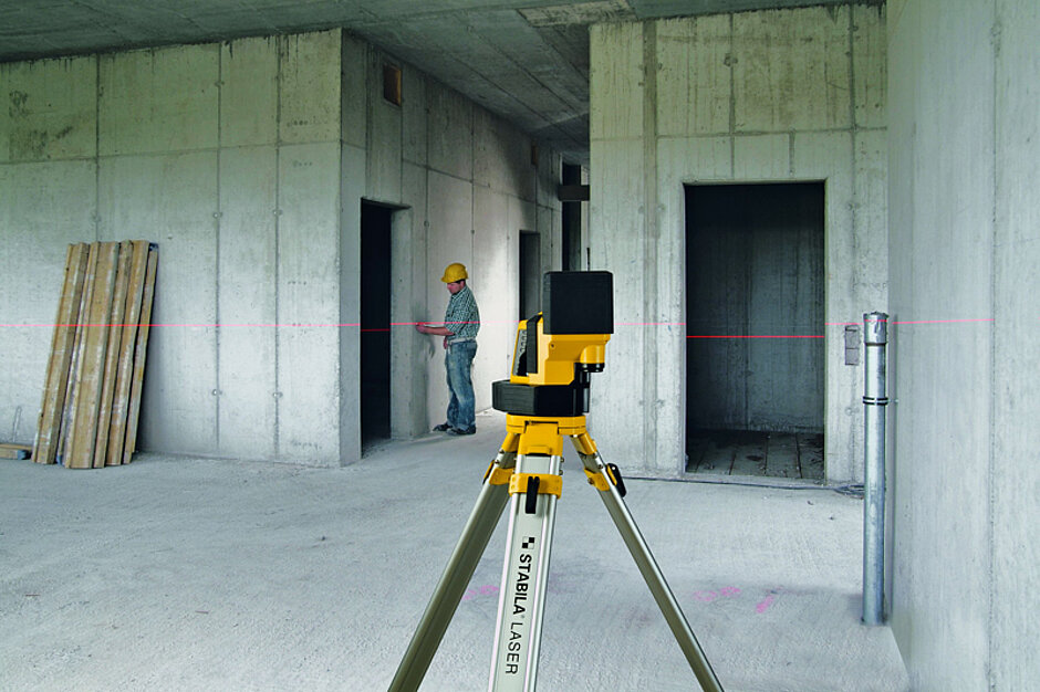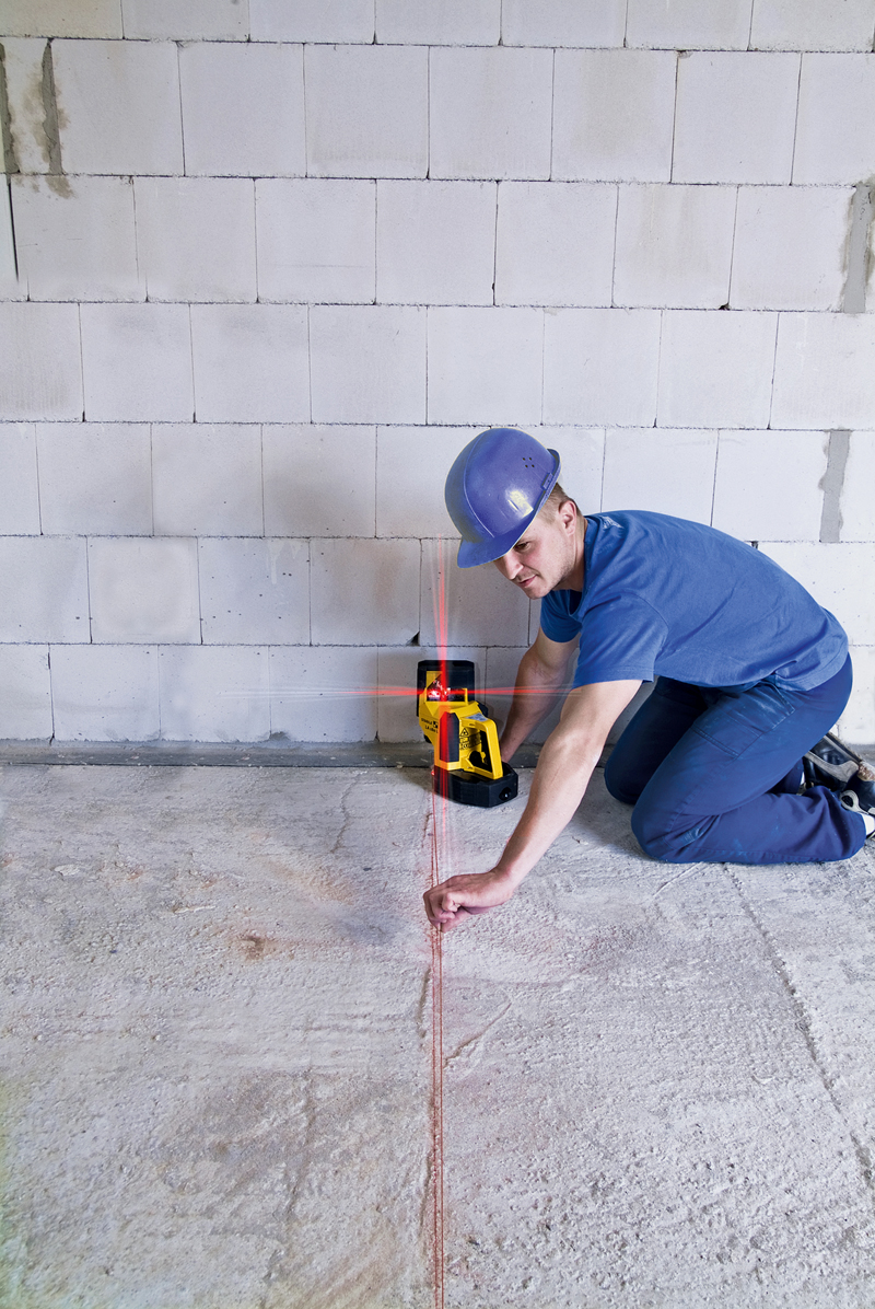 Die Gehäuseform des batteriebetriebenen Lasers ermöglicht die Positionierung in Raumecken und über Kanten (z. B. Betonplatte) – so lassen sich rechte Winkel schnell prüfen. Die Laserlinien seien gut sichtbar und besonders scharf, sodass direkt auf ihnen gearbeitet werden kann. Im Zusammenspiel der gepulsten Laserlinien mit dem Receiver sind laut Stabila exakte Höhenmessungen möglich, auch über große Distanzen (bis zu 100 m) im Innen- und Außenbereich. Der »LA 180 L« mit Stativ-Anschlussgewinde dreht sich vollautomatisch über dem nach unten strahlenden und leicht einsehbaren Lot. Nach oben kreuzen sich die beiden Vertikal-Linien präzise über dem Lotpunkt, was die Übertragung von Layouts vom Boden zur Decke vereinfacht. J