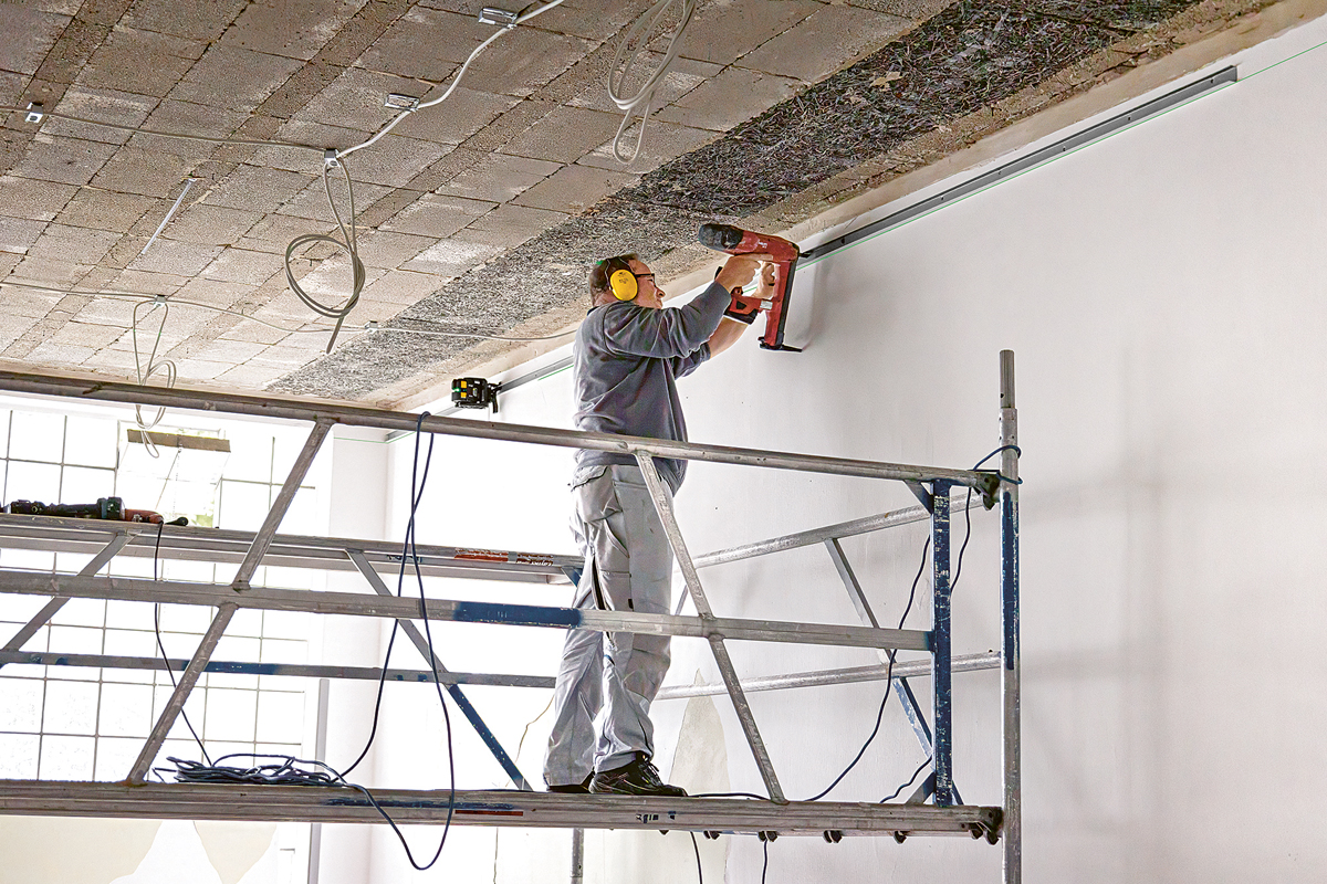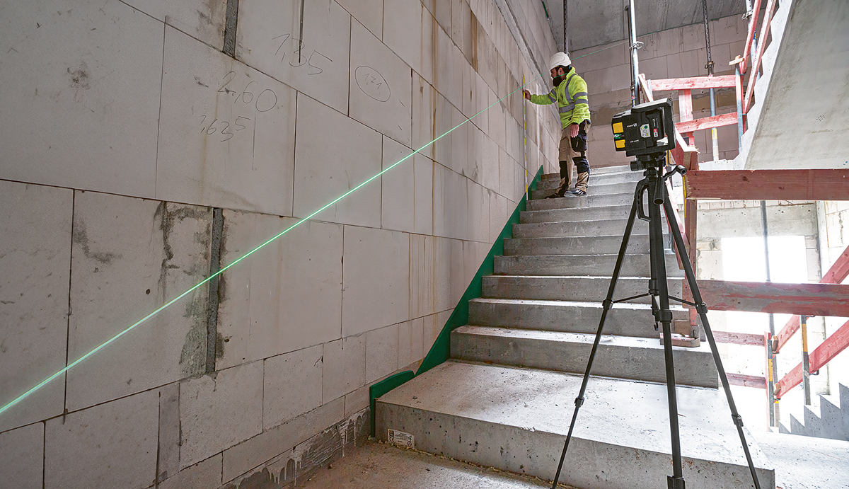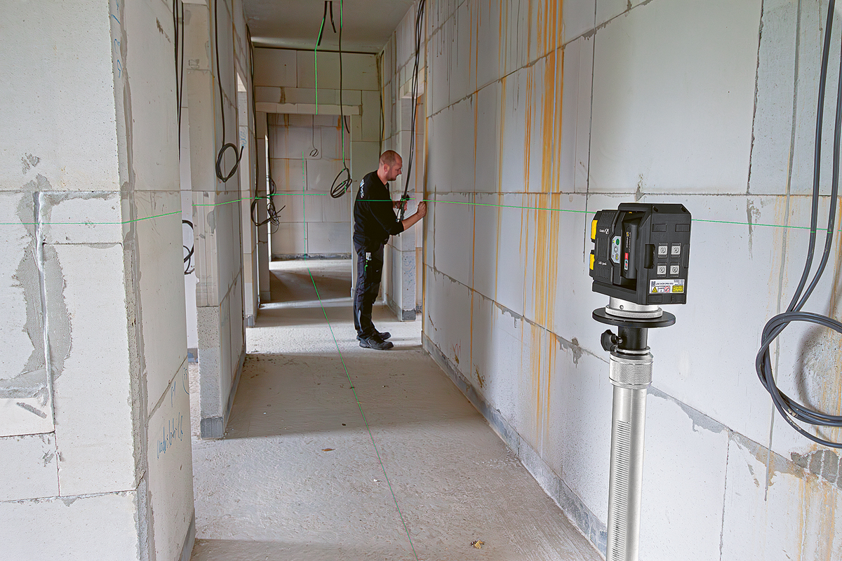 Die baustellengerechte Pendel-Technologie sorgt für eine schnelle Selbstnivellierung und damit für den sofortigen Einsatz des Lasers. Er lässt sich einfach und komfortabel handhaben, da jeder Taster nur eine Funktion hat. Ausgestattet ist er mit der »Greenbeam«-Technologie von Stabila: Die optimal sichtbaren grünen Linien erlauben direktes Arbeiten in bis zu 40 m Entfernung. Der Einsatzbereich der zuschaltbaren pulsmodulierten Linien lässt sich durch den als Zubehör erhältlichen Receiver »REC 500 RG« sogar auf bis zu 150 m vergrößern. Mit einem Lot nach oben und unten wird das Layout vom Boden an die Decke präzise übertragen.