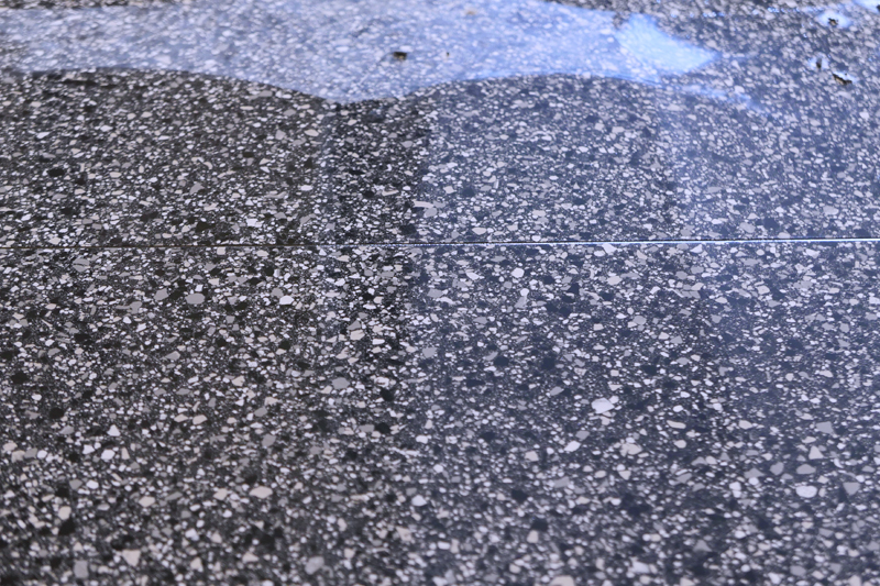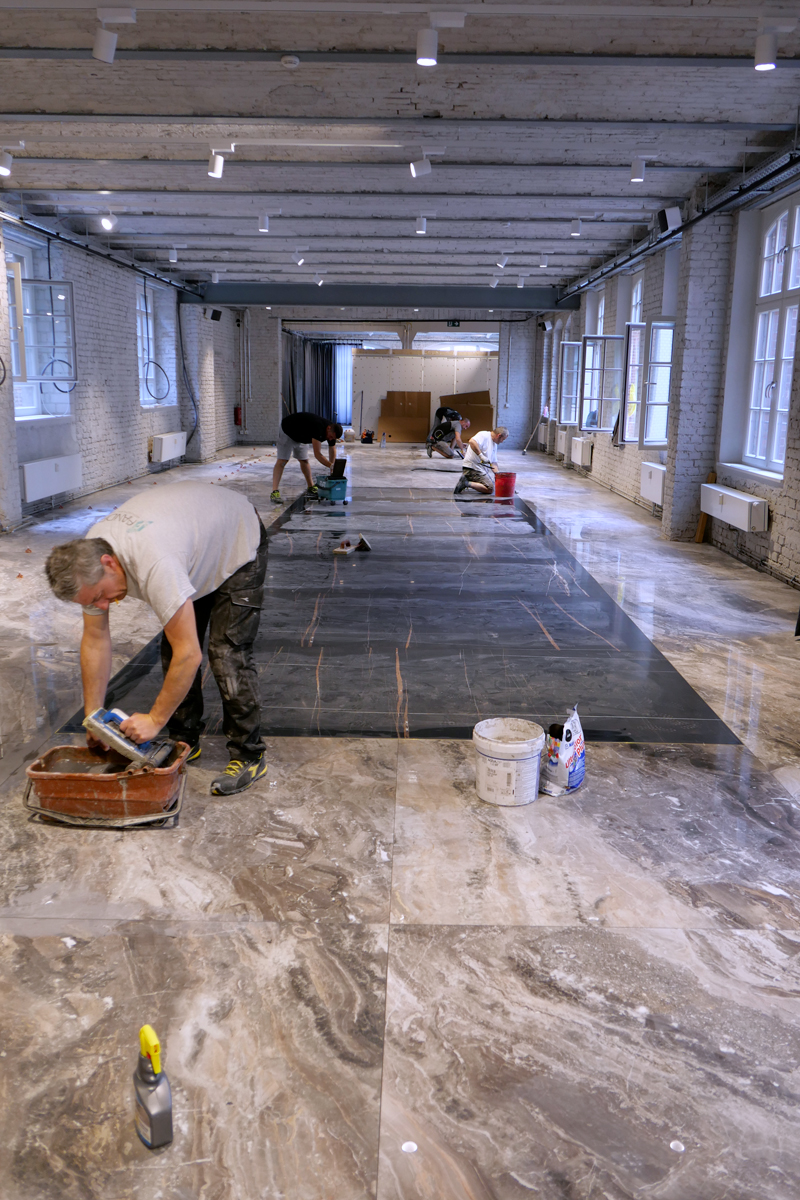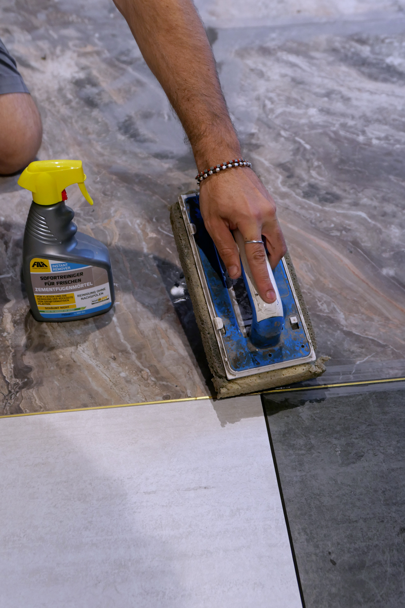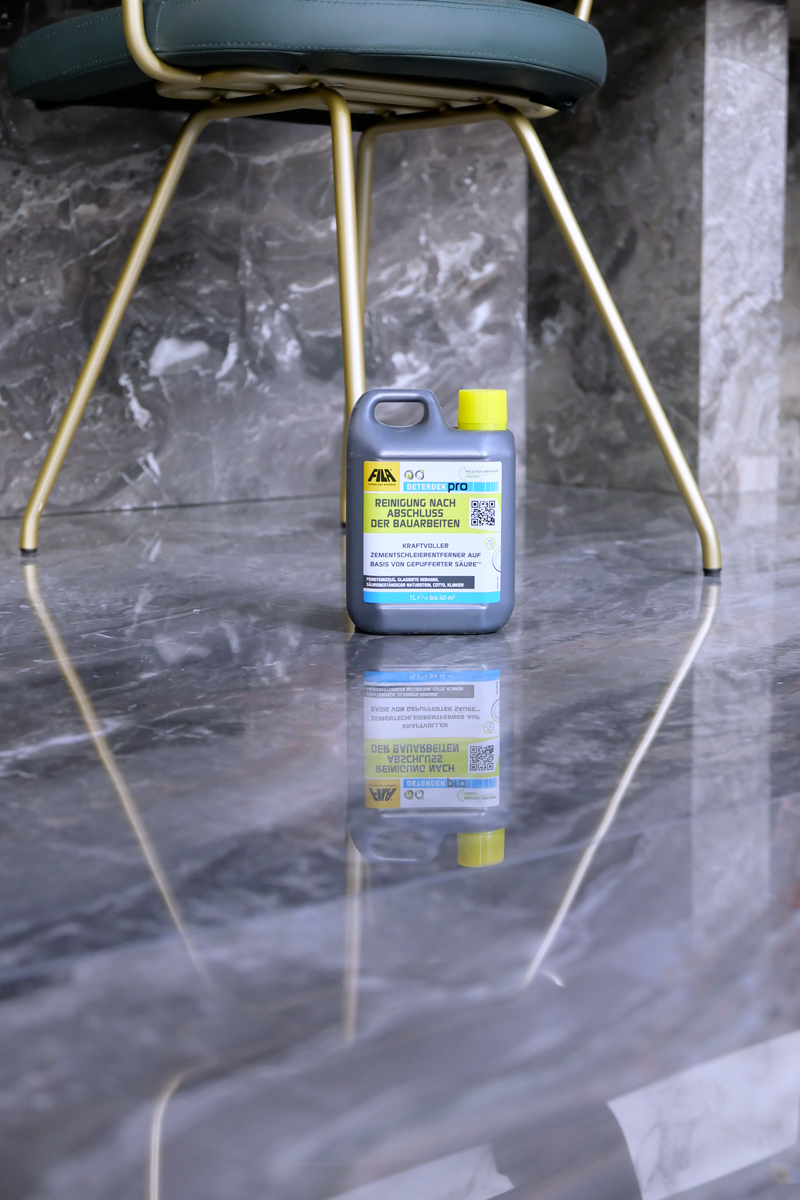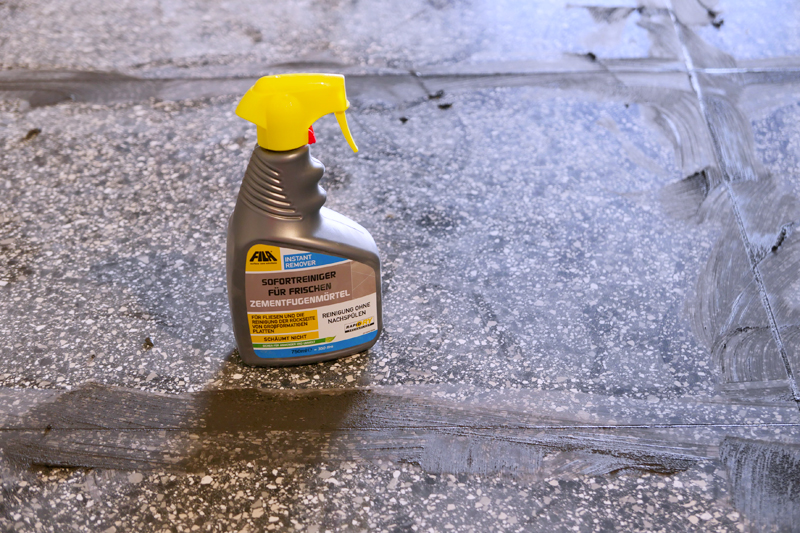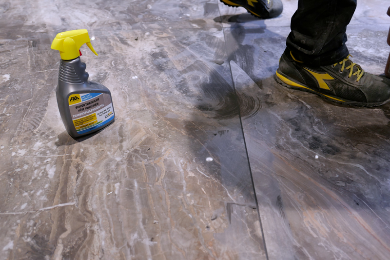 Auf der 500 m2 großen Fläche kam bereits während der Verlegung der Sprühreiniger INSTANT REMOVER zum Einsatz: Der Sofortreiniger wurde für die Reinigung der Tafelrückseite der Maximum Formate vor dem Verkleben und frisch in frisch vor der letzten Reinigung mit dem Schwammbrett verwendet.