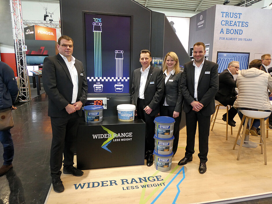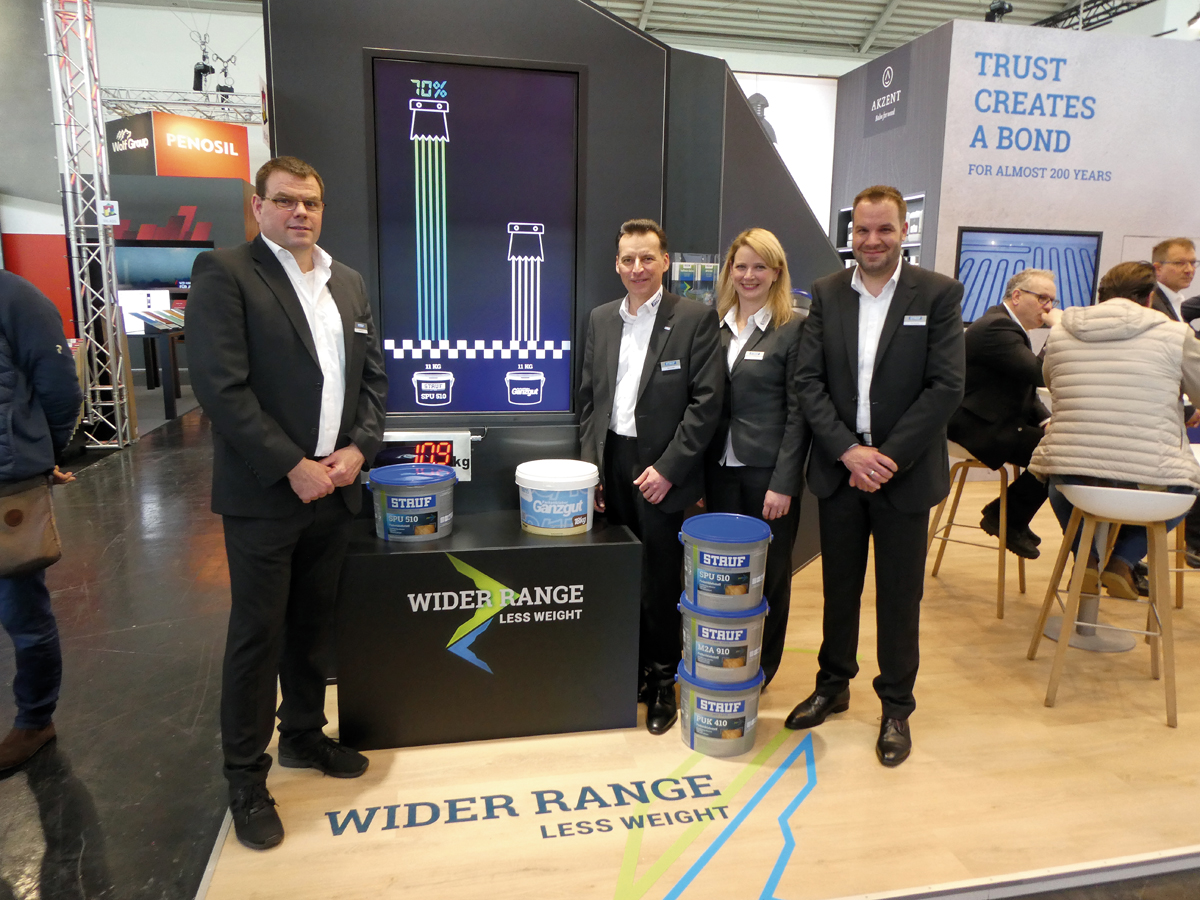 Im Fokus des Messeauftritts standen die Produkte der »ProForce«-Serie. Das sind drei nachhaltige Klebstoffe, genauer gesagt der Silanklebstoff »Stauf SPU 510«, der Dispersionsklebstoff «Stauf M2A 910« sowie der Polyurethanklebstoff »Stauf PUK 410«.