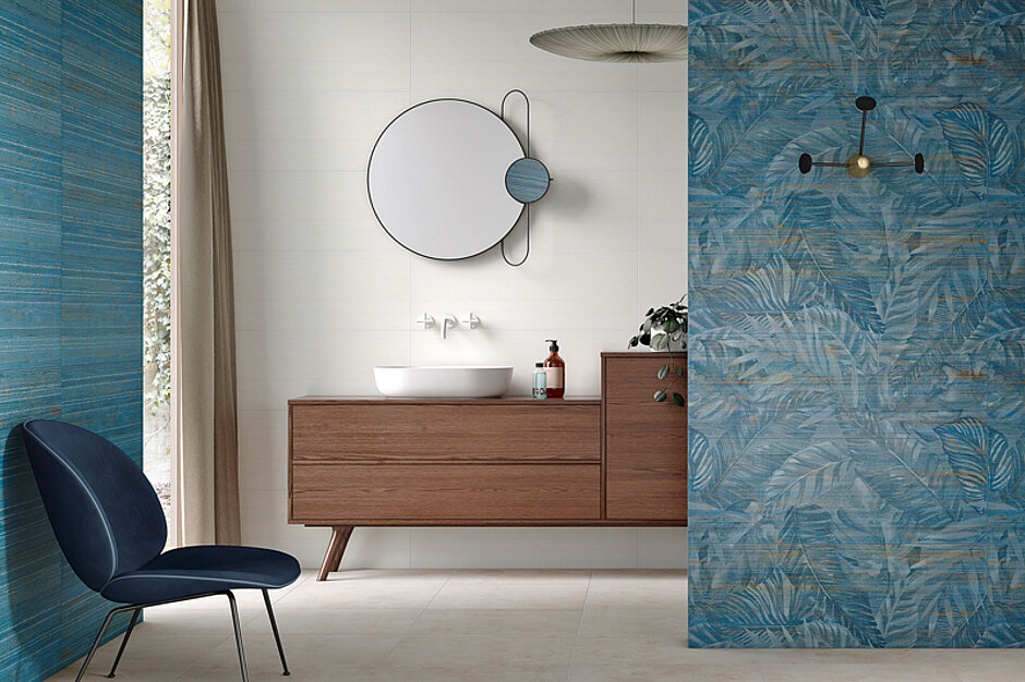 »Blue Jungle« wurde laut Hersteller von Künstlern wie Frida Kahlo und Jonas Wood inspiriert. Es leitet den Blick mit seinem von Blattwerk inspirierten Design in geheimnisvolle Tiefen und lädt zu einer Entdeckungsreise ein. »Blue Moon« ergänzt diese Stimmung mit einer Optik, die an zartschimmerndes Mondlicht erinnert, das sich silbrig-metallisch glänzend auf einer Wasseroberfläche bricht, heißt es in einer Mitteilung des Unternehmens. Dafür würden unter anderem Granulat-Spuren sorgen, die der Fliese einen zusätzlichen haptischen Mehrwert verleihen. Die weiße Grundfliese gleiche mit ihrer matten Oberfläche, Struktur und Haptik edlem Gewirk, was den Dekoren eine luftig-leichte Basis zur Seite stelle.