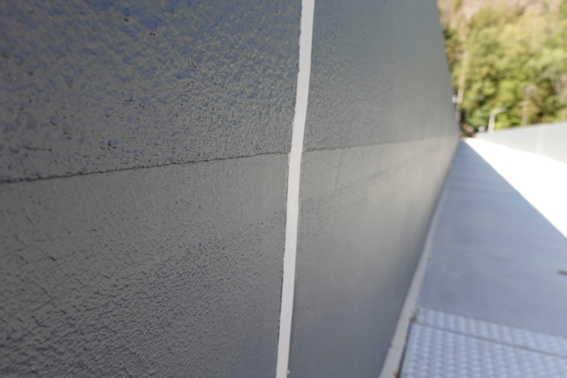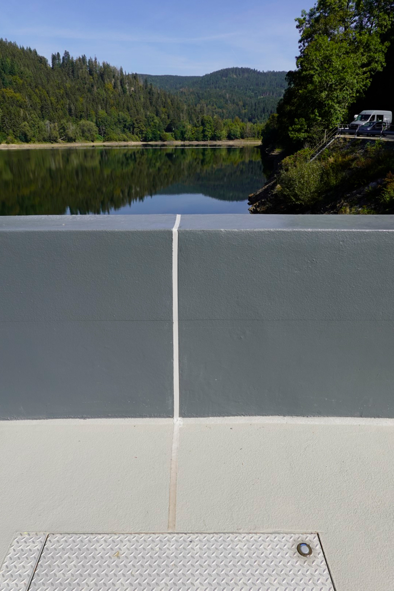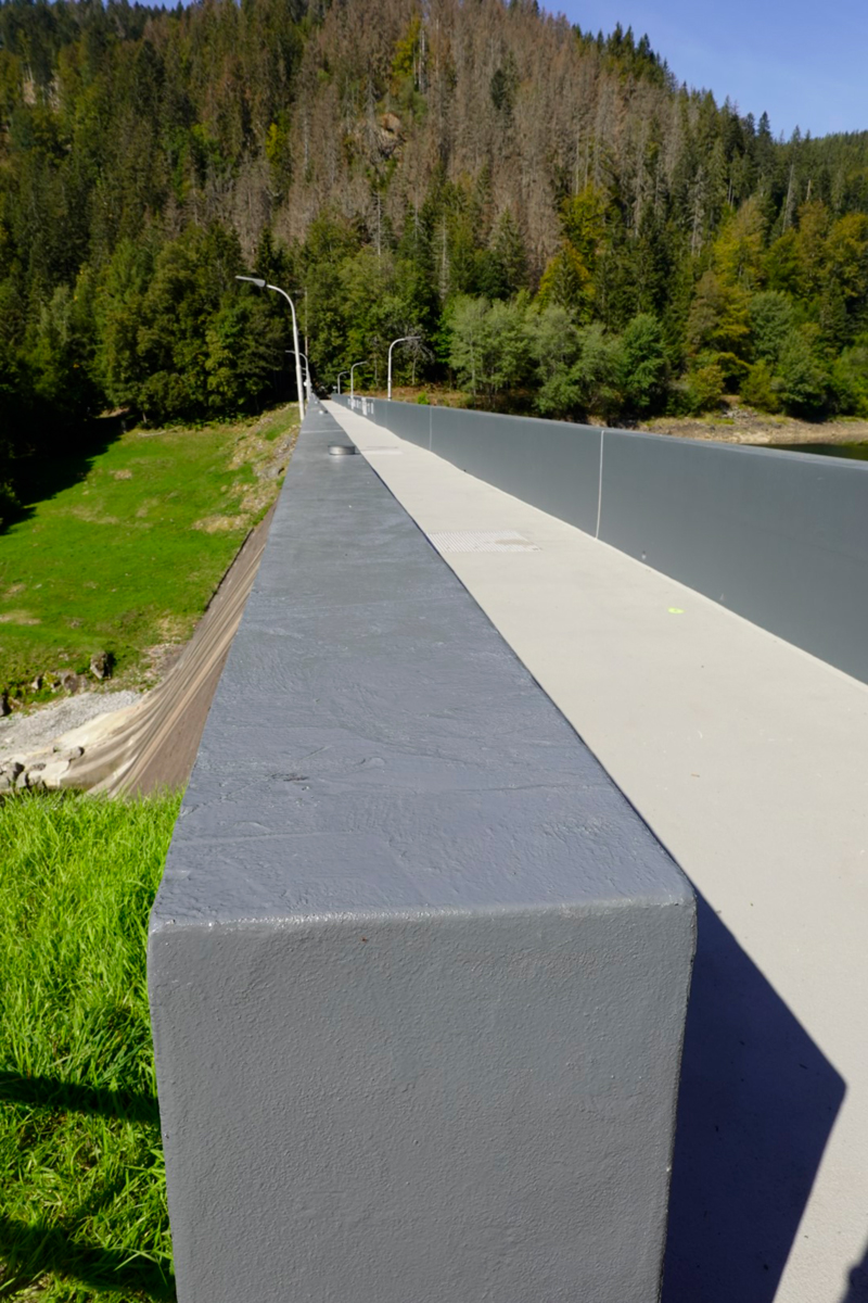Die begeh- und befahrbare Bodenfläche der Staumauerkrone erhielt das hochbeständige, rutschhemmende und rissüberbrückende Beschichtungssystem »StoFloor Traffic Elastic 590 EP« mit der Beschichtung »StoPox 590 EP« und der Versiegelung »StoPur DV 508«. Ein Betonersatz war hier nicht erforderlich. J