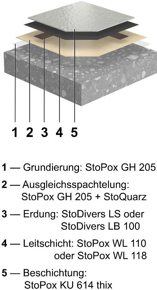 Verarbeiterfreundlich optimiert: Durch die werkseitig thixotropierte B-Komponente lässt sich mit »StoPox KU 614 thix« sehr einfach eine strukturierte Oberfläche der Rutschhemmklasse R9 herstellen. Qualitativ bietet die Beschichtung das hohe Niveau von »StoPox KU 614«: Beide sind elektrisch volumenleitfähige Beschichtungen mit hoher mechanischer Beständigkeit, die die kontrollierte Ableitung elektrostatischer Ladungen sicherstellen. Schon ab einer niedrigen Luftfeuchtigkeit von zwölf Prozent erfüllen sie die in der ESD-Norm (DIN EN IEC 61340-5-1) geforderte Leitfähigkeit. Eine zusätzliche Versiegelung ist nicht notwendig. Die sehr guten Verlaufseigenschaften ermöglichen einen wirtschaftlichen Verbrauch.