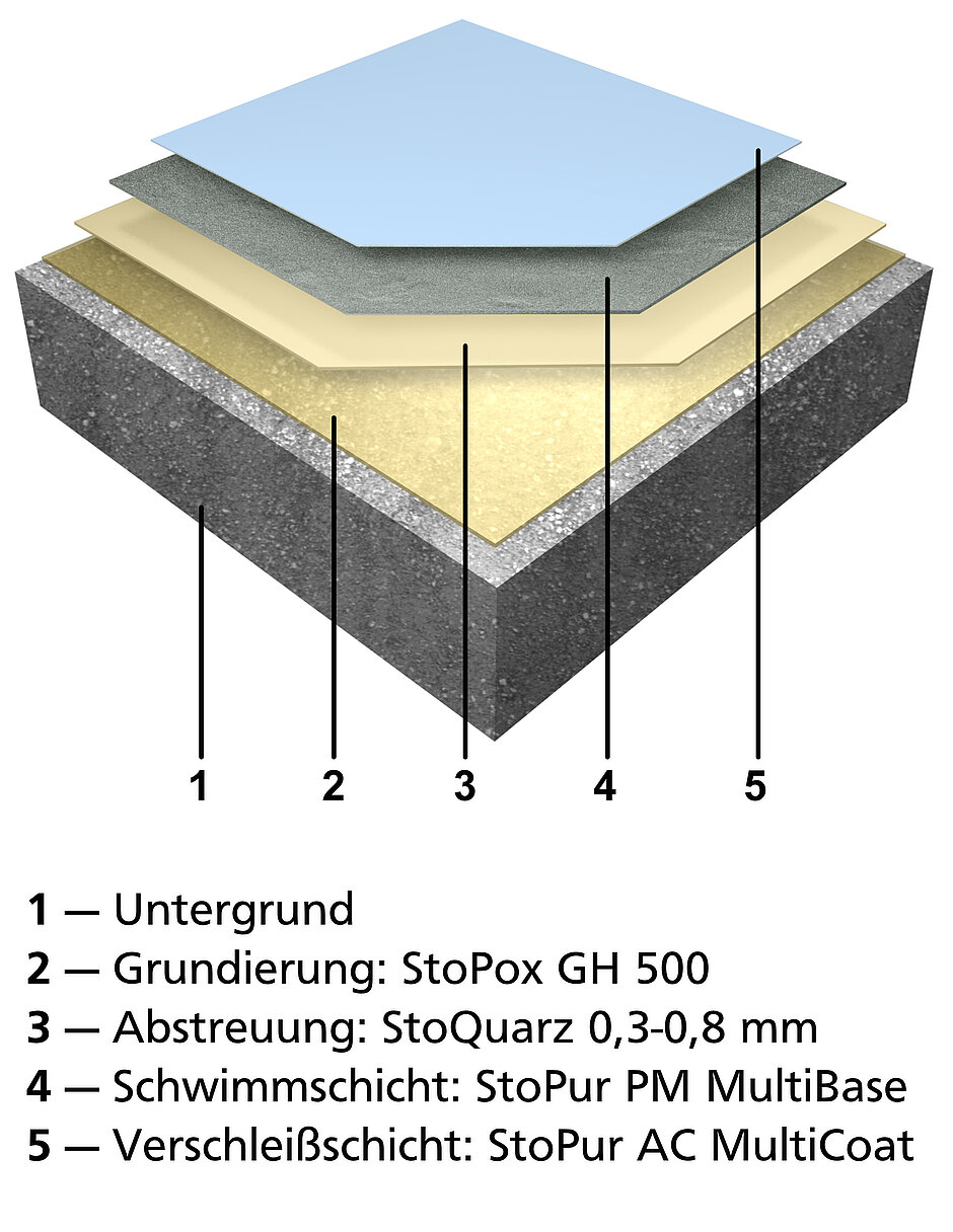 Das Verkehrsflächensystem StoFloor Traffic Elastic PM MultiBase härtet schnell aus, auch bei niedrigen Temperaturen, und ist schon wenige Stunden nach der Applikation befahrbar. Mit PUR-Abdichtungsmembran und Polyurea-Verschleißschicht verfügt es über eine erhöhte dynamische Rissüberbrückung (Klasse B 4.2 bei -20 °C). Es braucht keine Kopfversiegelung, denn die Verschleißschicht StoPur AC MultiCoat ist hoch abriebfest und verschleißbeständig. Bei der Verschleißprüfung in Anlehnung an DIN EN 660-1:06-1999 (Pendeltest) gab es nach 2.000 Doppelhüben keinen Masseverlust. Das Material ist chemisch beständig gegen Öle, Treibstoffe und Tausalz sowie - 2 - UV- und farbtonstabil – die Parkflächen vergilben nicht und bleichen nicht aus.
