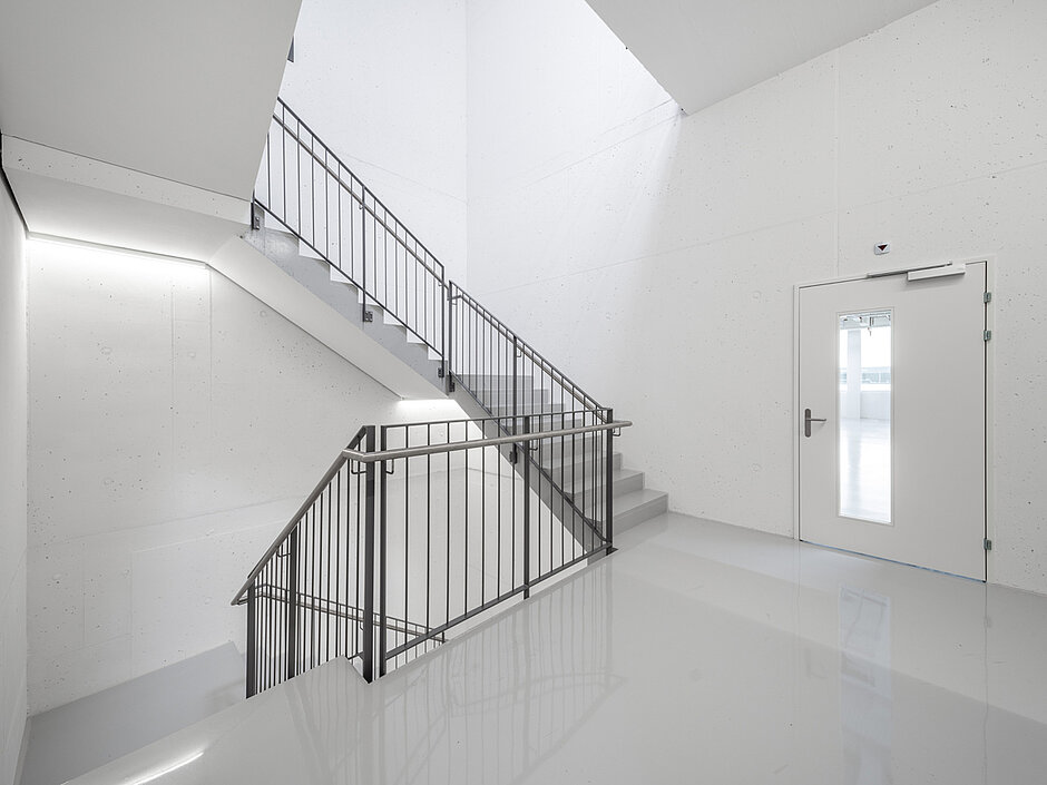 Für die etwa 4 000 m² Flure und Gänge des neuen Gebäudes war ein robuster, dauerhafter Boden in hochwertiger Optik vorgesehen. Als optimale Lösung ist hier der Allrounder »StoFloor Industry BB OS« im Einsatz. Das widerstandsfähige Bodenbeschichtungssystem ist emissionsarm, dauerhaft und radondicht. Mit »StoDivers Mattierungsmittel« rutschhemmend (Klasse R10) eingestellt, sorgt es für Sicherheit in den hellen Räumen. Das selbstverlaufende Epoxidharzsystem eignet sich für Gehverkehr und Transportfahrzeuge gleichermaßen.