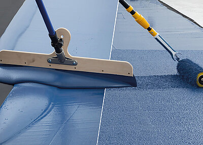 Für die WU-Beton-Bodenplatte war ein rissüberbrückendes System gefordert, das sich zugleich für rückwärtige Feuchtebelastung eignet. Ein gewöhnliches, starres OS 8-System kam aufgrund der fehlenden Rissüberbrückung nicht infrage. Also wählte das Expertenteam die langjährig erprobte Lösung »StoFloor Traffic Elastic 590 EP« von StoCretec. Die gewünschte Farbgebung in den Unternehmensfarben der Kaufmännischen Krankenkasse war für den Bauchemie-Spezialisten kein Problem.