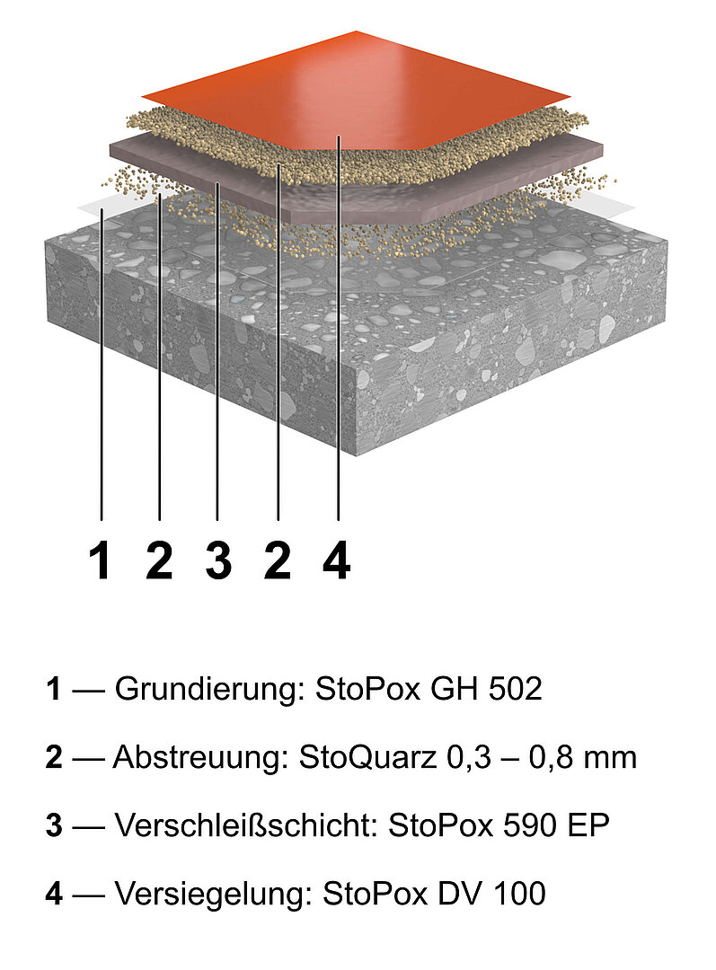 Werden Bodenplatten nicht fachgerecht abgedichtet und mit einem hierfür ungeeigneten Bodensystem beschichtet, kann sich das Material durch aufsteigende Feuchtigkeit lösen. Seine Funktionalität – der Schutz des Betons – ist dann nicht mehr gewährleistet. Für diesen Spezialfall bietet StoCretec seit nunmehr zehn Jahren »StoFloor Traffic Elastic 590 EP« an. Das System ist wasserdampfdurchlässig und rissüberbrückend. Es lässt Feuchtigkeit aus dem Untergrund entweichen, ohne die Beschichtung anzuheben. Ablösungen oder strukturelle Beeinträchtigungen durch rückseitige Feuchte werden so nach Unternehmensangaben wirksam vermieden. Zugleich verhindert es, dass sich Bewegungen im Untergrund auf die Oberfläche übertragen – es entstehen keine Risse in der Beschichtung. Eine nachträgliche Risssanierung ist nicht notwendig, wodurch das homogene Erscheinungsbild der Oberfläche erhalten bleibt. Dank seiner sehr guten Verschleißfestigkeit schützt »StoFloor Traffic Elastic 590 EP« die Bausubstanz dauerhaft vor Wasser und darin gelösten Schadstoffen.