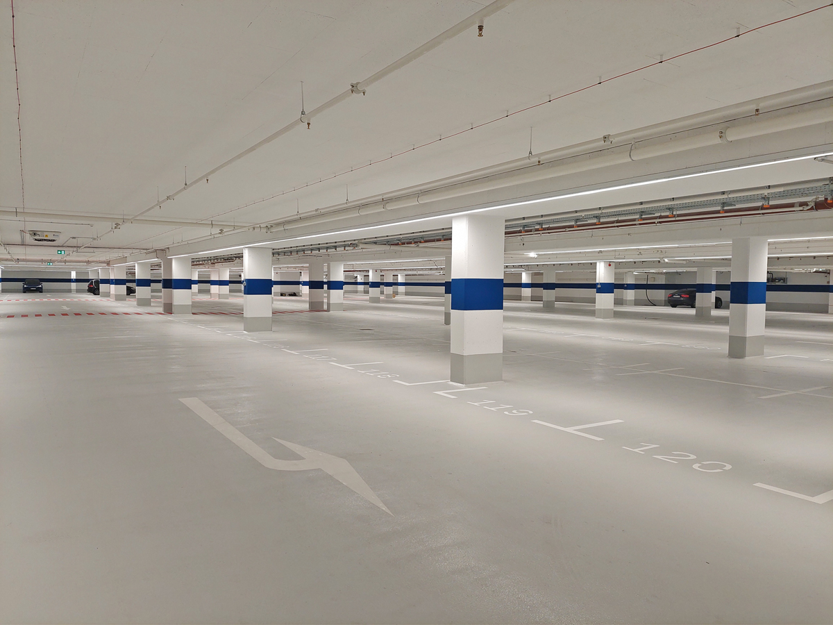 450 Parkplätze bietet die Tiefgarage des 2024 eröffneten HafenMarkt in Münster. Weil die Bodenplatte durch die Nähe des Gebäudes zum Mittelhafen enorm durch Grundwasser belastet ist, entschied sich der Bauherr für das wartungsarme, wasserdampfdiffusionsfähige OS 8-Oberflächenschutzsystem »StoFloor Traffic Elastic 590 EP« von StoCretec. Eine weitere Herausforderung war die hohe mechanische Belastung des Beschichtungssystems durch häufiges Überrollen mit beladenen Einkaufswagen. Ein maßgeschneiderter Verschleißtest bei der TU Kaiserslautern gab dem Bauherrn Sicherheit.