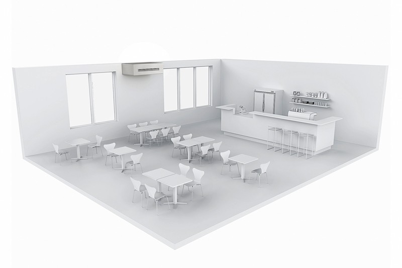 Die Geräte eignen sich zur direkten Deckenmontage. Außen- und Fortluftanschluss befinden sich an der Geräterückseite zur einfachen Installation direkt an der Außenwand. Zwei Wanddurchführungen und ein Stromanschluss genügen. Bei Nennlüftung arbeiten die Geräte auf dem Schallniveau eines Kühlschranks. J