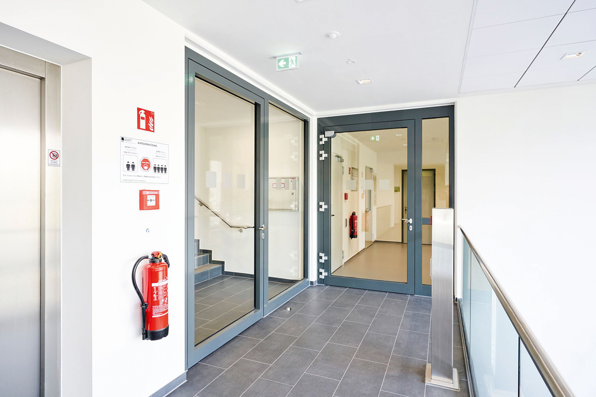 Durch das Baukastensystem in den Ausführungen »T30« und »T90« (zukünftig auch »T60«) ist es möglich, immer mit dem gleichen Profil, der gleichen Beschlagart und mit gleichen Arbeitsschritten und Werkzeugen zu arbeiten – das spart Zeit und Kosten, schon bei der Arbeitsvorbereitung. Neben Brand- und Rauchschutz sind zudem weitere multifunktionale Eigenschaften möglich: Schallschutz bis 45 dB, Einbruchschutz bis RC 2. Sogar eine nachträgliche Um- oder Aufrüstung ist möglich: Sollte sich im Lebenszyklus die Nutzung einer Immobilie ändern und in diesem Zuge beispielsweise Durchgänge von »Standard« zu »Fluchttür« werden, lässt sich dieser Wechsel mit einem einfachen Tausch der Beschläge durchführen, Zarge und Türblatt werden einfach weiter genutzt.