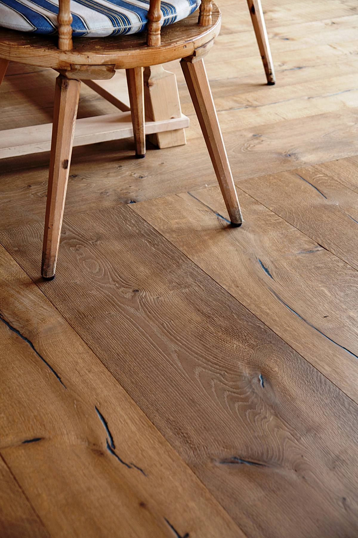Auch die Materialvielfalt mit Fokus auf heimische Holzarten wie Esche, Fichte/Tanne, Ulme/Rüster oder Lärche ist beim Tegernseer Dielenwerk groß. Durch eine gezielte Bearbeitung lassen sich diese nuancenreich verändern oder man nutzt verschiedene Verlegearten als visuellen Effekt – beispielsweise das traditionelle, aber topaktuelle Fischgrätmuster. Intelligente Raumelemente wie maßgefertigte Treppenstufen runden das Produktportfolio »Naturholzböden« ab.