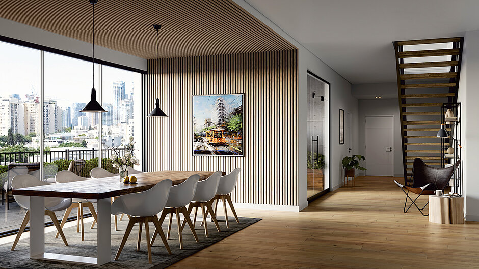 Auch im Bereich Wand & Decke bietet ter Hürne vielfältige Neuerungen. So wird das Mitte des Jahres vorgestellte Dekorpaneel-Programm »UniqueDesign« erstmals öffentlich gezeigt. Es bietet durch die Kombinationsfähigkeit von linearen Paneelen und Flächenpaneelen eine zeitgemäße, fast unendliche Gestaltungsvielfalt für die moderne Wand- und Deckengestaltung. Das Sortiment »SilentDesign«-Akustikpaneele erweitert ter Hürne um weiße Varianten im skandinavischen Stil. So bietet der Südlohner Spezialist die Kombination von Eiche weiß mit weißem Filz und Eiche weiß mit schwarzem Filz, jeweils in den Abmessungen 2 400 mm und 3 000 mm Länge. Hinzu kommen die Designquadrate in der Abmessung 530 x 530 mm, die den Trend zur partiellen Wandgestaltung mit Akustikfunktion aufgreifen. In drei Varianten von Eiche hell, Eiche Natur und Nussbaum mit dreiseitiger Echtholzoberfläche der Lamellen bieten die Südlohner ein kompetentes Programm an, das direkt mitnahmefähig ist.