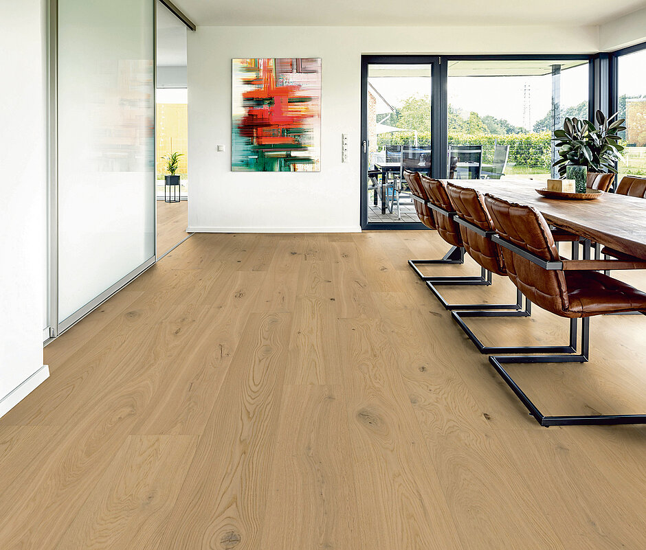Ein zusätzlicher Pluspunkt für die Beratungsfreiheit: Die Designs der Eichen-Landhausdielen sind ebenfalls im Format der Schlossdiele erhältlich und untereinander kombinierbar – auch farbliche Kombinationen sind möglich. Dadurch kann sich der Endkunde bei der Auswahl komplett auf optische Aspekte konzentrieren.