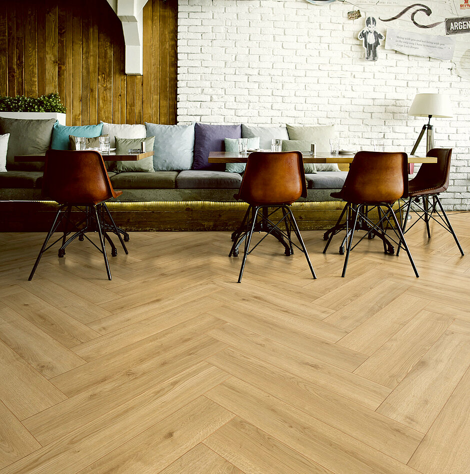 Ter Hürne ist aber noch einen Schritt weitergegangen – auch der Sortimentsbereich Laminat hat seit Juli Zuwachs in Form von neun Fischgrät-Dekoren erhalten. Die neue Kollektion soll durch das Zusammenspiel attraktiver Designs in Kombination mit intelligenter Technologie eine Angebotsvielfalt für den anspruchsvollen, preissensiblen und gleichzeitig trendbewussten Konsumenten bieten. Die neue »Herringbone Edition«, die eine gute Ergänzung zu den drei bestehenden Laminat Kollektionen bildet, überzeugt mit einer facettenreichen Auswahl trendstarker Eichen-Dekore im Format 665 x 133 x 10 mm. Das harmonische Dimensionsverhältnis 5 zu 1 ist hierbei ein gängiges, beim Verbraucher beliebtes Format. Die preisattraktiven Dekore, die durch das DIY-fähige Klicksystem »SmartConnect HB« mit »Fold-Down«-Technologie hohen Verlege-Komfort bieten, sind durch ihre Produktstärke von 10 mm und eine Abriebklasse von AC5 laut ter Hürne außerordentlich leistungsfähig.