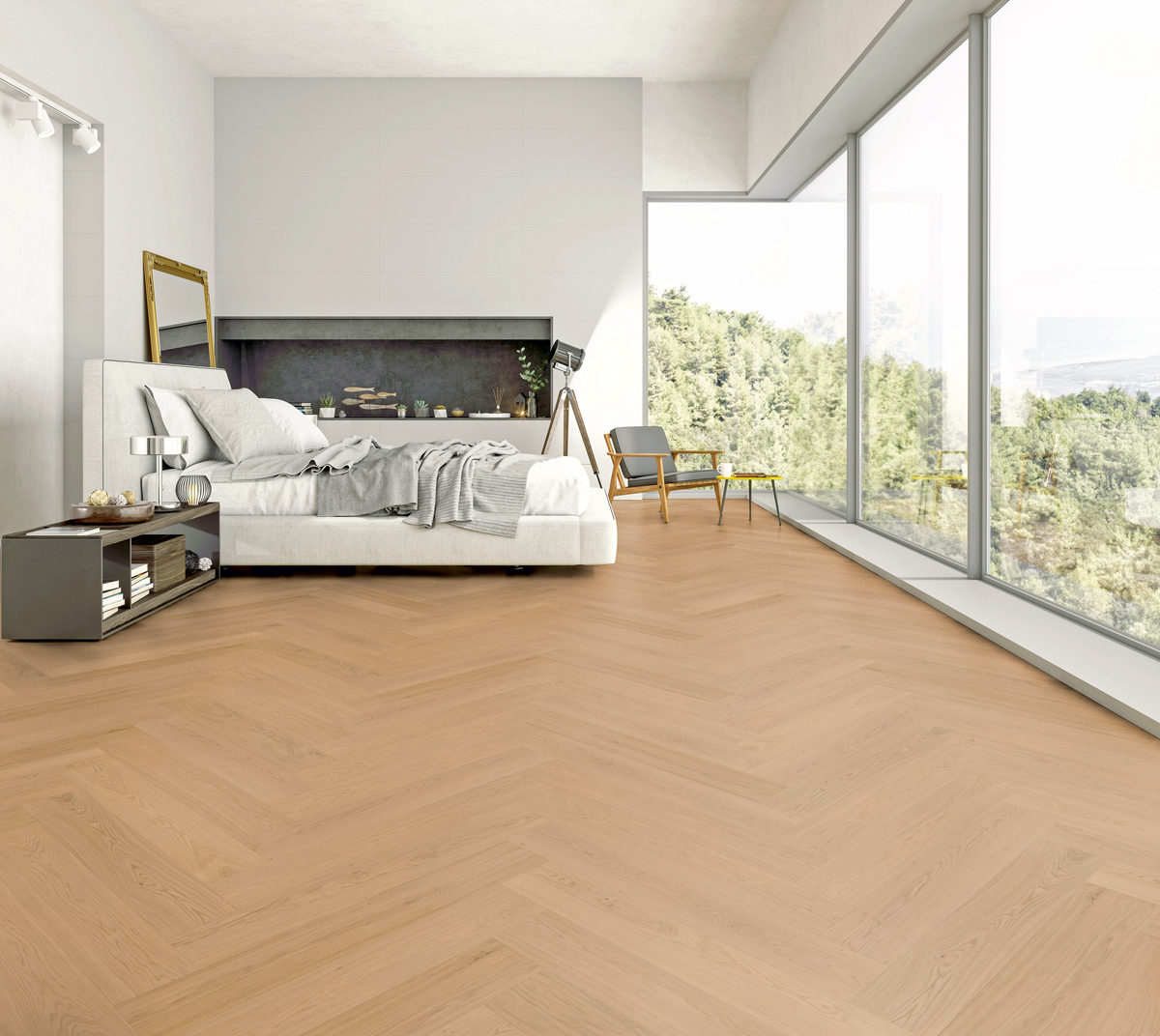 Die Schaffung eines gesunden Ambientes steht für ter Hürne selbstredend im Fokus – jedes der Produkte im Gesamtportfolio zeichnet sich durch seine wohngesunden Eigenschaften aus. Die neuen Fischgrät-Dekore machen dabei keine Ausnahme, denn Auszeichnungen wie der »Blaue Engel« und das eco-Zertifikat bestätigen, dass die Laminatböden emissionsarm und wohngesund sind. J