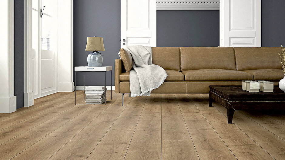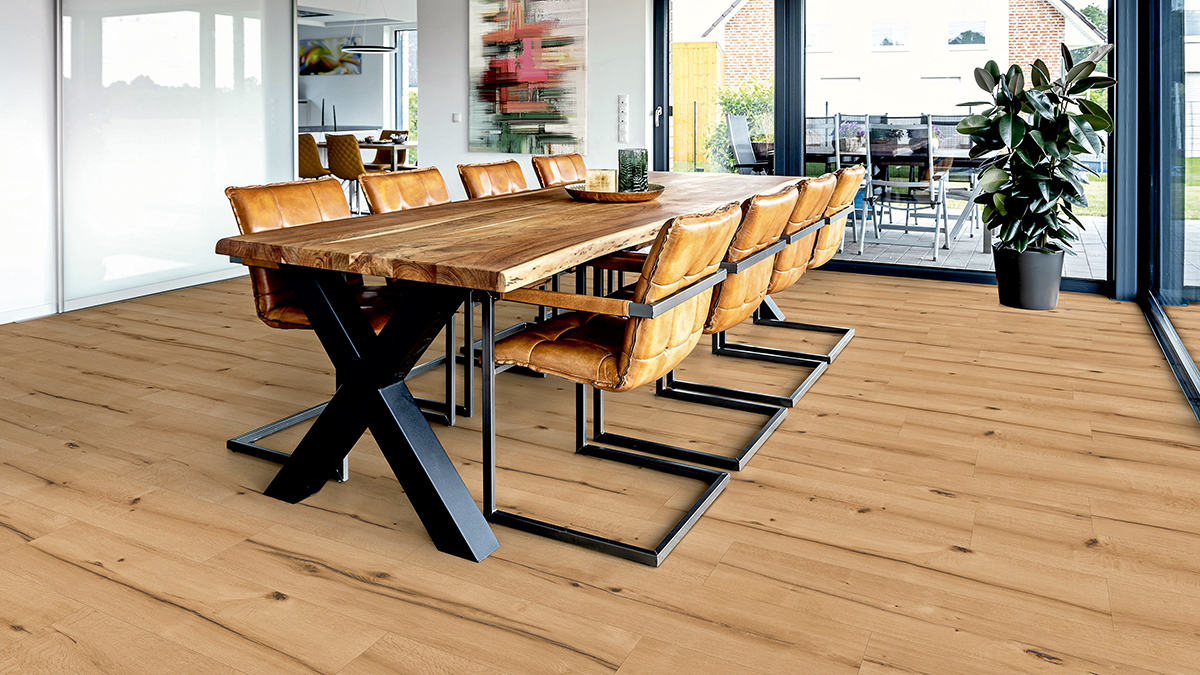 Bei »Ikõ« dreht sich alles um die Natürlichkeit und Authentizität von Holz. Das ter Hürne-Designteam hat auf dieser Basis vier Kollektionen mit insgesamt 36 Dekoren entwickelt. Die Designs spiegeln nicht nur die Holzart, sondern auch die feine Maserung und Struktur detailgetreu wider. Der Trend geht bei den Kollektionen zu größeren Formaten, stärkeren Produktausprägungen und natürlich auch formatigen Umsetzungen im Fischgrätbereich. Gerade bei Letzteren ist die Laminatoberflächen-Technologie den Angeboten im Designbereich mindestens gleichwertig. Vor allem bei Kleinformaten, aber natürlich auch bei Dielen ist das Thema Fase ein wichtiges Gestaltungselement, das bei Laminat wesentlich überzeugender umgesetzt wird als bei anderen Produkten. Es gibt laut Hersteller nur eine Ausnahme: das deutlich höherpreisige Parkett.