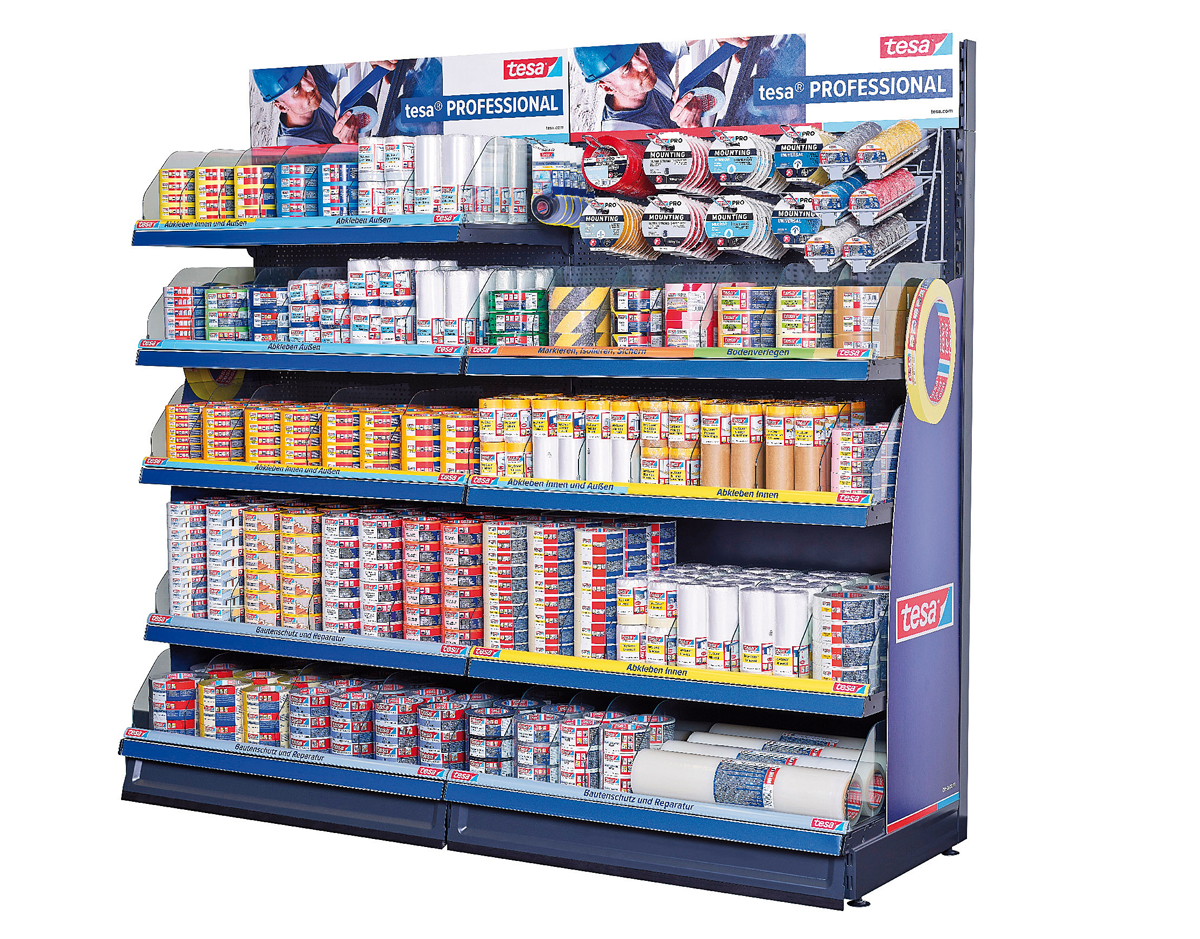 Um den Baufachhandel beim Verkauf dieser Produkte optimal zu unterstützen, hat Tesa einen Verkaufsassistenten in Form eines variablen Regalsystems entwickelt. Das Stammplatzierungsmodul (verfügbar in vier Regalabmessungen) schafft Ordnung, gibt dem Kunden eine schnelle Orientierung und erleichtert so die Kaufentscheidung. Das Regalsystem hat drei Hauptmerkmale: Zum einen das Kopfschild mit dem »tesa Professional«-Logo und einem Key-Visual. Dann die einzelnen Regalschienen, die als Navigationsleiste dienen. Die einzelnen Segmente sind farblich untergliedert und entsprechend beschriftet (z. B. »Abkleben außen« oder »Bautenschutz und Reparatur«). Schließlich die Produktkennzeichnung. Piktogramme mit Qualitäts- und Anwendungsmerkmalen sowie Colour-Coding erleichtern hier die Auswahl. Das Regalsystem ist in den Abmessungen 1,25 x 1,60 m, 1,25 x 1,80 m, 1,00 x 1,60 m und 1,00 x 1,80 m jeweils als 1er- oder 2er-Modul verfügbar.