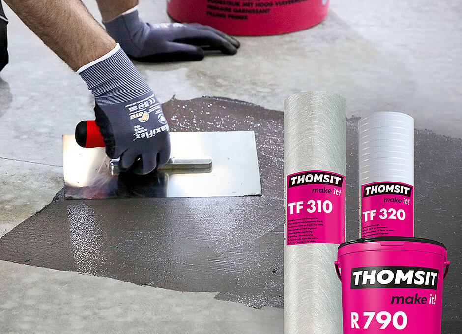Dieses THOMSIT-Renoviersystem funktioniert unabhängig davon, ob der Altestrich einzelne breitere Risse oder eine spinnennetzartig gerissene Oberfläche aufweist: Für grobe Risse bis zu 5 mm kommen die Glasfaserstränge THOMSIT TF 320, eingebettet in die Füllgrundierung THOMSIT R 790, zum Einsatz und für feine Risse das Glasfaservlies THOMSIT TF 310. Bei einem Boden mit unterschiedlichen Rissbreiten lassen sich die Produkte auch kombinieren.