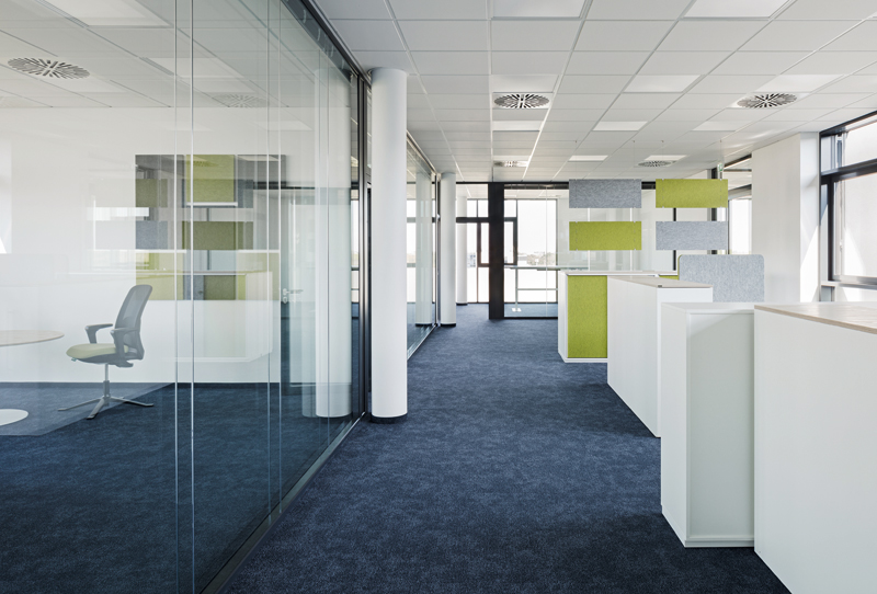 Die gewählte Variante »Newcon 1852« kennzeichnet eine sanfte, richtungsfreie Melierung, die mit dem Farbspektrum von Möbeln und Absorbern in verschiedenen Grüntönen, Weiß und Grau harmoniert. Aufgrund der besonderen Tuftingtechnologie – Toucan-T arbeitet mit 16 Nadeln je Zoll – sind die Fliesen zudem voluminös. Dadurch versprechen sie nicht nur hohen Gehkomfort, sondern tragen auch zum akustischen Wohlempfinden in den Räumlichkeiten bei. So verleiht der auf 4 500 m2 verlegte textile Bodenbelag allen fünf Geschossen des Grüner-Punkt-Neubaus die gewünschte hochwertige Optik und einladende Behaglichkeit.